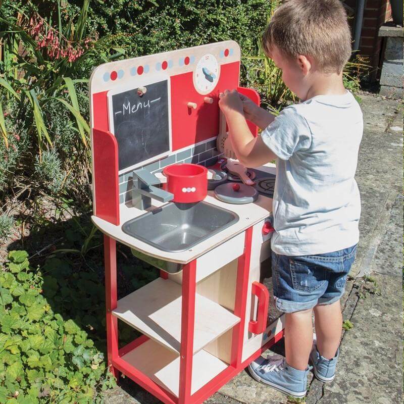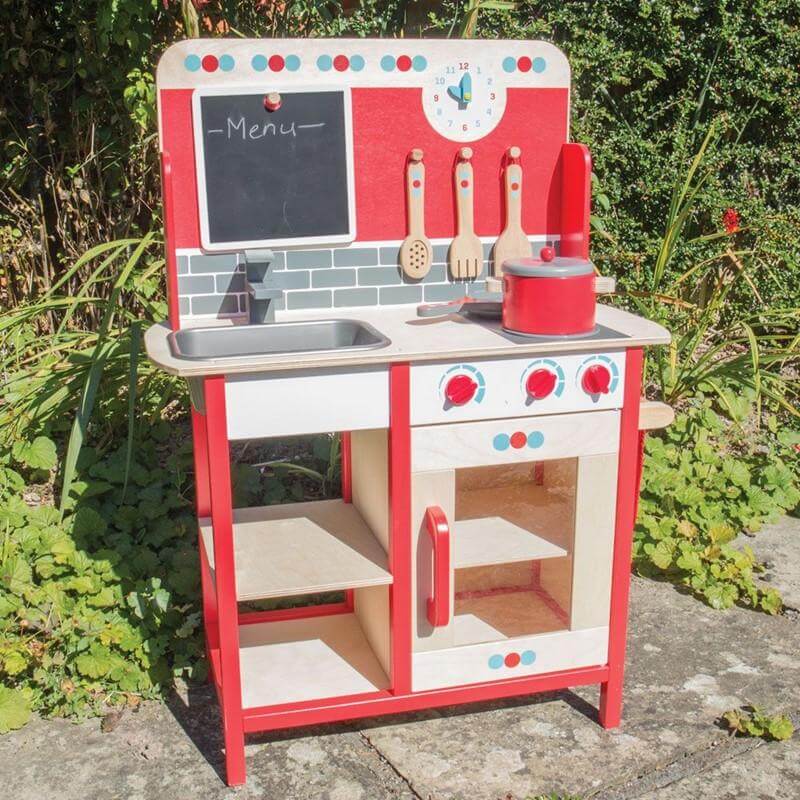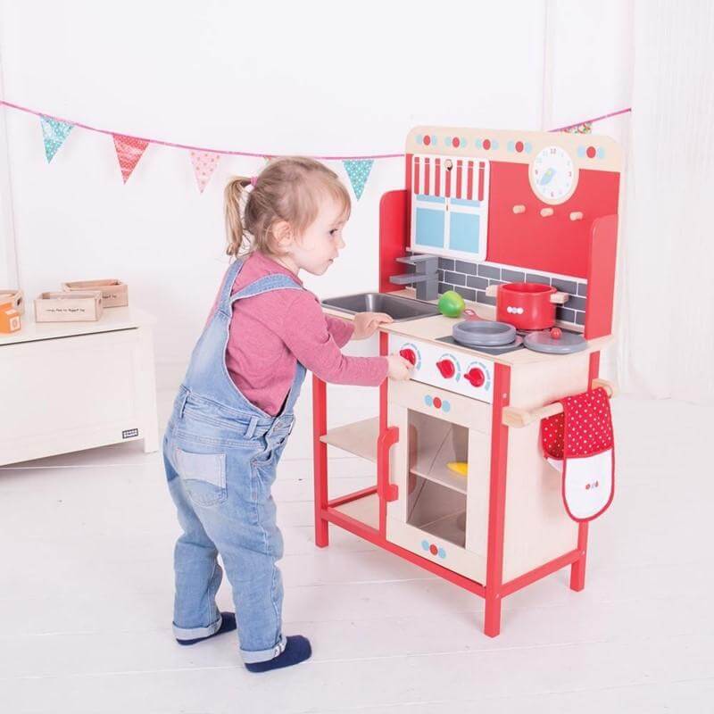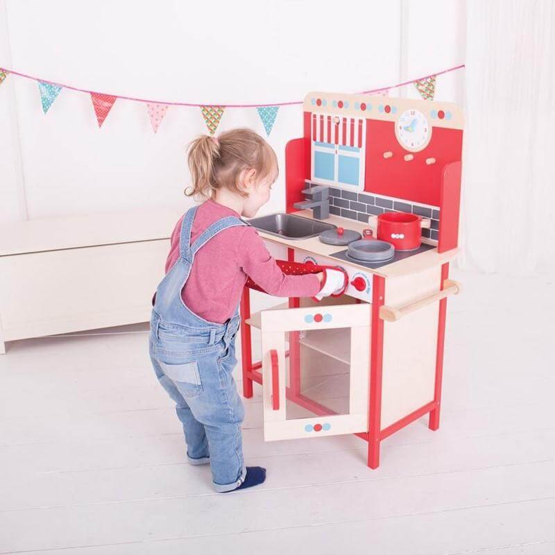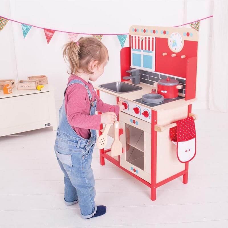 Дървена червена кухня Bigjigs съдържа всичко необходимо, за да може малкият готвач да приготвя истински гурме ястия - тенджера, тиган, дървени лъжица, решетеста лъжица и шпатула. Ключетата на печката се въртят и издават кликащ звук, а фурната се отваря, но не забравяйте да използвате готварските ръкохватки, когато вадите храната от фурната. Часовникът над кухнята е с мърдащи се стрелкички, за да наблюдавате да не изгори ястието, а прозорецът се маха, като под него има черна дъска за писане с тебешир, на която можете да пишете дневното меню или пък рецепти. Заниманията с Дървена червена кухня Bigjigs са полезни за развитието на ролевата игра и въображението. Изработката е от дърво и е боядисана с бои на водна основа. Изисква се монтаж от възрастен. Посочената цена е за 1 брой. Разгледайте още продукти в категорията "Детски дървени кухни и аксесоари" - ТУК! Комплектът съдържа: кухня, съдове за готвене, дървени прибори за готвене и готварски ръкавици.