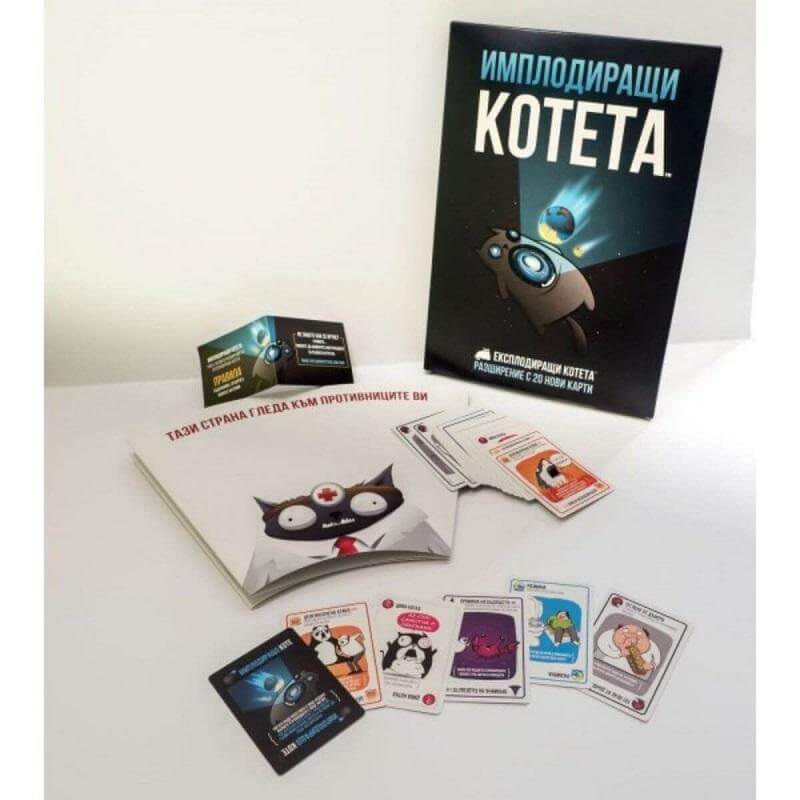 Имплодиращи котета - настолна семейна игра с карти е разширение на популярната игра "Експлодиращи котета". В кутията ще откриете 20 нови карти, имплодиращо коте, което ви позволява да играете до 6 души. Включен е и голям конус на срама в човешки размери, който да сложите на главата на играча. Той е предназначен за играча, който е забравил реда си. Имплодиращи котета - настолна семейна игра с карти е игра, която можете да играете със семейството си или приятели навсякъде, където и да се намирате. Можете да разгледате останалите продукти от категорията "Настолни игри" ТУК!