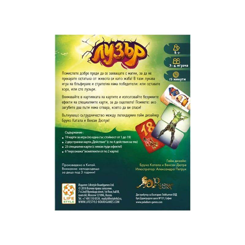 Лузър - детска настолна игра с карти за цялото семейство е игра, която се състои основно от блъфиране. Ако не внимавате, може да се превърнете в жаба. Всеки рунд се играе с карта, която е с лицето нагоре или надолу. Трябва да гласувате, за да определите дали вие сте притежателят на картата с най-голяма стойност. Ако допуснете повече от две грешки, то може да останете жаба до края на живота си. Специалните карти се използват за осуетяване на плановете на опонентите, но и те могат да ги използват. В Лузър - детска настолна игра с карти за цялото семейство няма стратегии и блъфиране - има само печеливши и жаби. Чудесна игра за път, семейна почивка или просто събиране с приятели. Можете да разгледате останалите продукти от категорията "Настолни игри" ТУК!