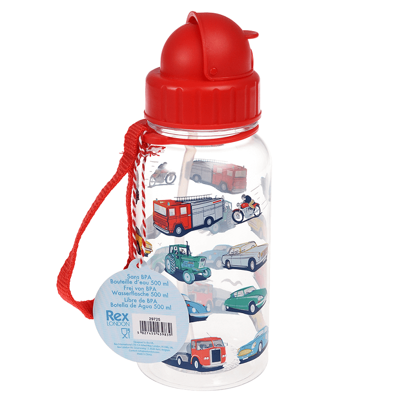 Детска бутилка за вода - Автомобили Rex London. Отпиването на вода никога не е било по-сладко, отколкото с бутилка за деца на Рекс Лондон! Тази детска бутилка за вода разполага с интегрирана сламка и найлонова каишка за носене, както и с интересен принт с автомобили - идеална за хидратиране в движение. Разгледайте още продукти в категорията “Бебешки аксесоари” – ТУК!