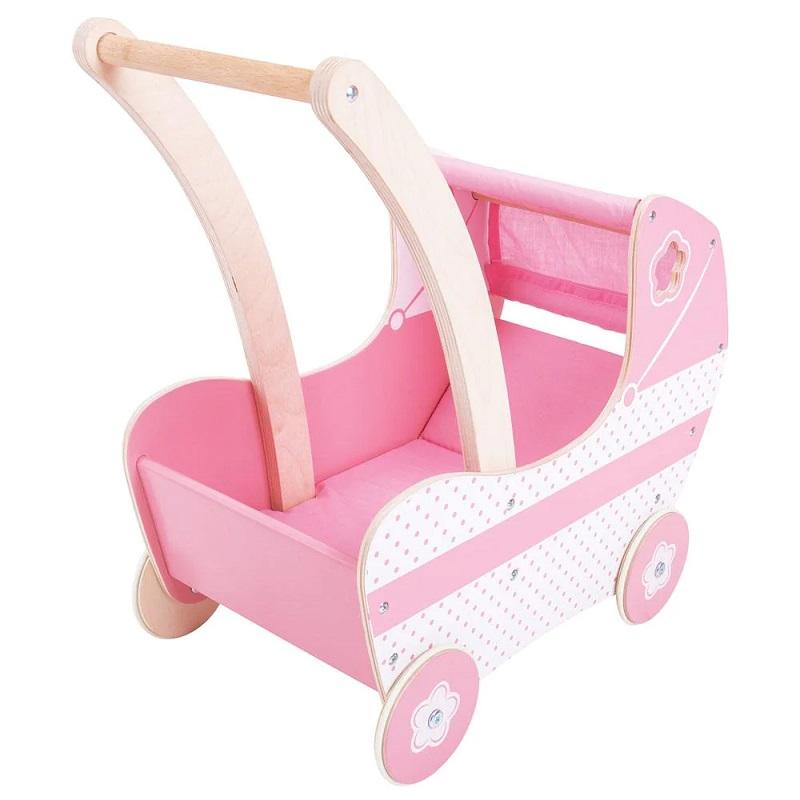 Характеристики на продукта Дървена количка за кукли в розово Bigjigs: