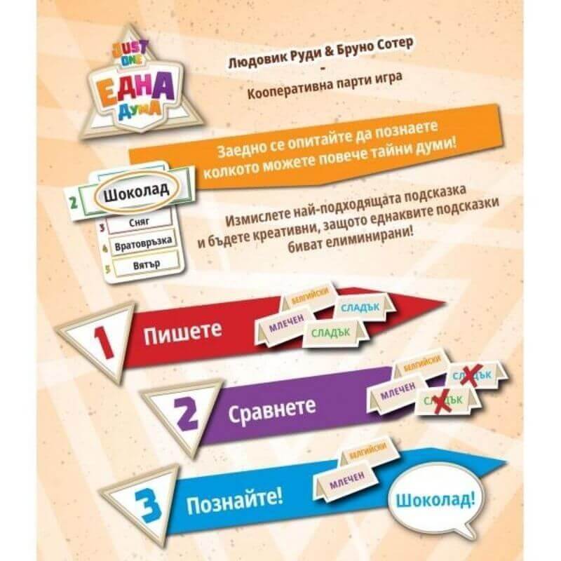 Една дума настолна парти семейна игра с карти е носител на наградата Spiel des Jahres през 2019, която е най-престижната. В нея всички участници са от един екип и се опитват да съберат точки. Всеки един играч ще бъде активен и трябва да се опита да познае думата. Другите участници се опитват да му подскажат. Условието е те да бъдат различни и да си ги запишете тайно. Не трябва да се консултирате с останалите играчи. Една дума настолна парти семейна игра с карти е забавна игра, която можете да играете навсякъде и по всяко място. Можете да разгледате останалите продукти от категорията "Настолни игри" ТУК!