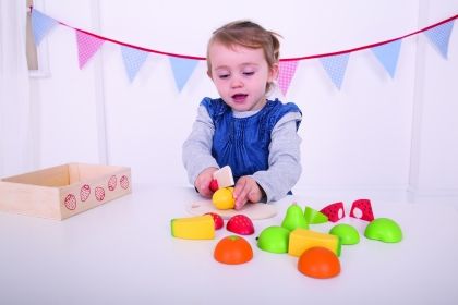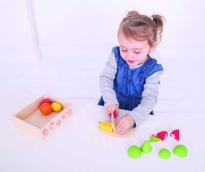 Комплект дървени плодове за рязане Bigjigs, който включва ярко оцветени ябълка, портокал, ягода, круша, банан, диня, лимон и разбира се, дъска и дървен нож, с който те могат да бъдат "нарязани". Дървените плодове и нож са предназначени за деца над 18 месеца и са абсолютно безопасни за игра. Комплект дървени плодове за рязане Bigjigs дава възможност на децата да се запознаят с различните видове плодове, както и да научат повече за здравословното хранене. Благодарение на ножа, изработен от дърво, те могат да опитат да ги "подготвят за ядене" и така да придобият представа за правилното боравене с него. За по-удобно съхранение на плодовете, кутията е снабдена с плъзгащ се капак. Посочената цена е за 1 брой. Разгледайте още продукти в категорията "Къщи за кукли и принадлежности" - ТУК!