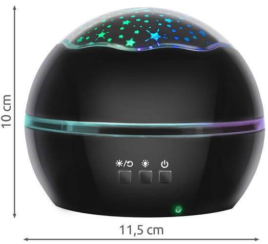 - цвят: черен - въртяща се куполна лампа: да - материал: пластмаса / метал - захранване: захранване / батерия 4 x AAA (не са включени) - 3 функционални бутона - 4 цвята светлина (зелено, синьо, бяло, червено) - размери (дължина / ширина / височина): 12/12 / 10см - тегло: 0,242 кг - тегло в опаковката: 0,339 кг - ВКЛЮЧЕНО: проектор, USB кабел, 2 наслагвания за проекторПроизводител