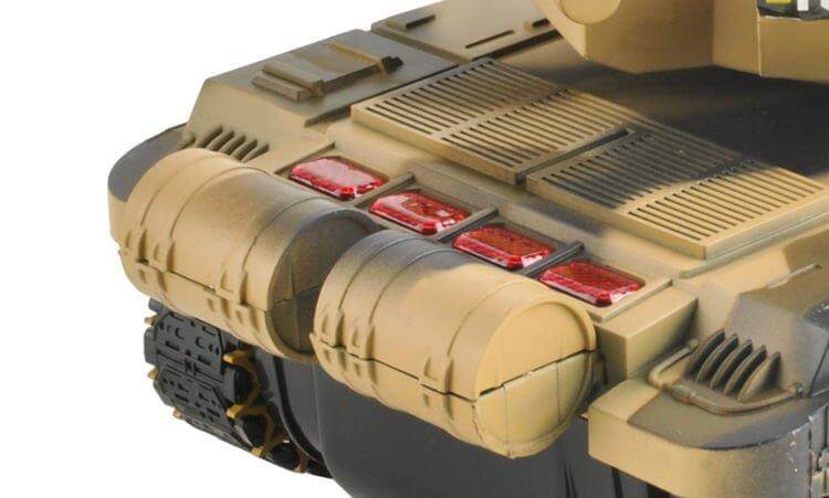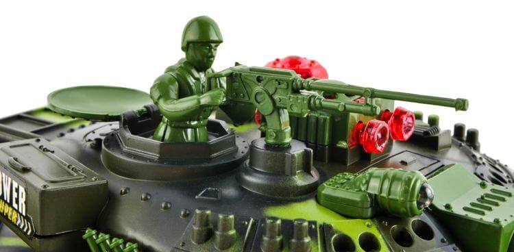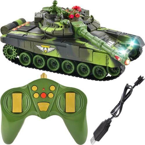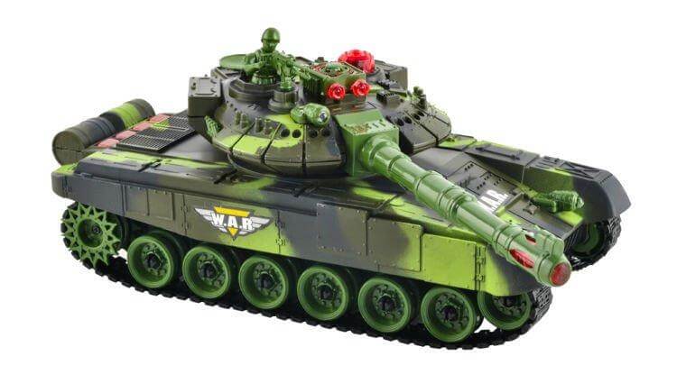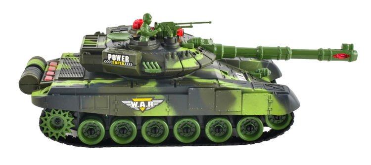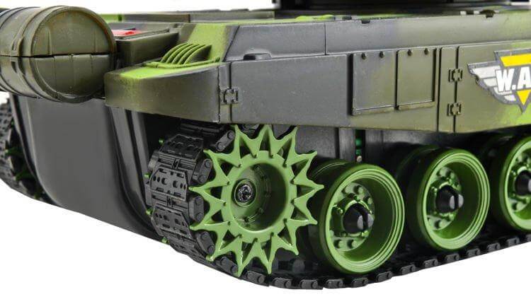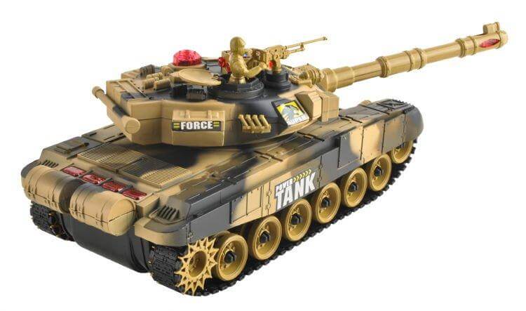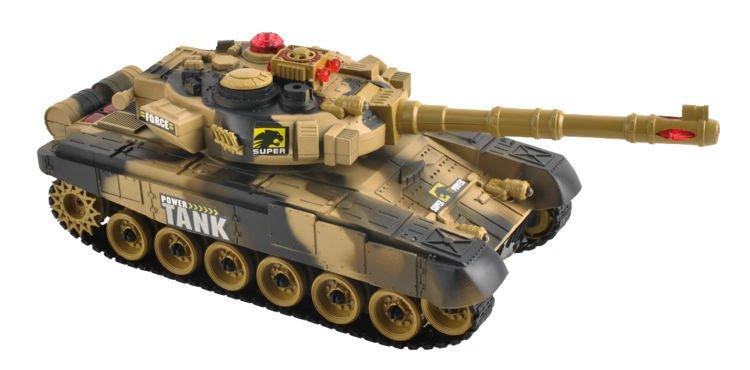 Танк с дистанционно управление за деца. Танкът с дистанционно управление е играчка не само за деца, той ще се хареса и на възрастни, ще осигури много часове забавление. Той има много висока мощност и ще отиде практически навсякъде, използваните светлини и звук правят танка да изглежда като истински, което стимулира въображението и насърчава още повече забавление. Продуктът има въртяща се кула до 360 градуса; когато го поставим в избраната позиция, можем да възпроизведем изстрел - танкът имитира звук и откат като на истинско бойно поле. Когато изстрелът е произведен точно, ще чуем звука от попадението в целта - светлината на губещия на гърба на танка ще изгасне. Когато всички светлини изгаснат, това означава, че битката е загубена и танкът ще бъде обездвижен за 30 секунди, след това време битката може да бъде рестартирана. Танкът се състои от меко верижно шаси, което ще осигури отлично сцепление по време на шофиране. В купола има отварящ се люк, в който можете да поставите танкер с картечница. Танкът и дистанционното са с отделни захранвания, комплектът включва акумулаторна батерия, което ви позволява да спестите голяма сума пари, изразходвани за батерията. Страхотна идея за подарък! Закупуването на 2 танка ще ви позволи да водите истинска битка за двама души едновременно, танковете имат различни честоти. Разгледайте още продукти в категорията “Подаръци за деца” – ТУК!
