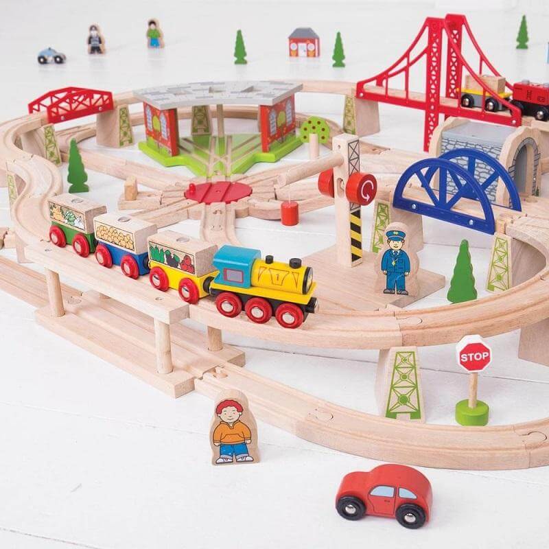 Товарен дървен влак с релси и аксесоари Bigjigs Rail