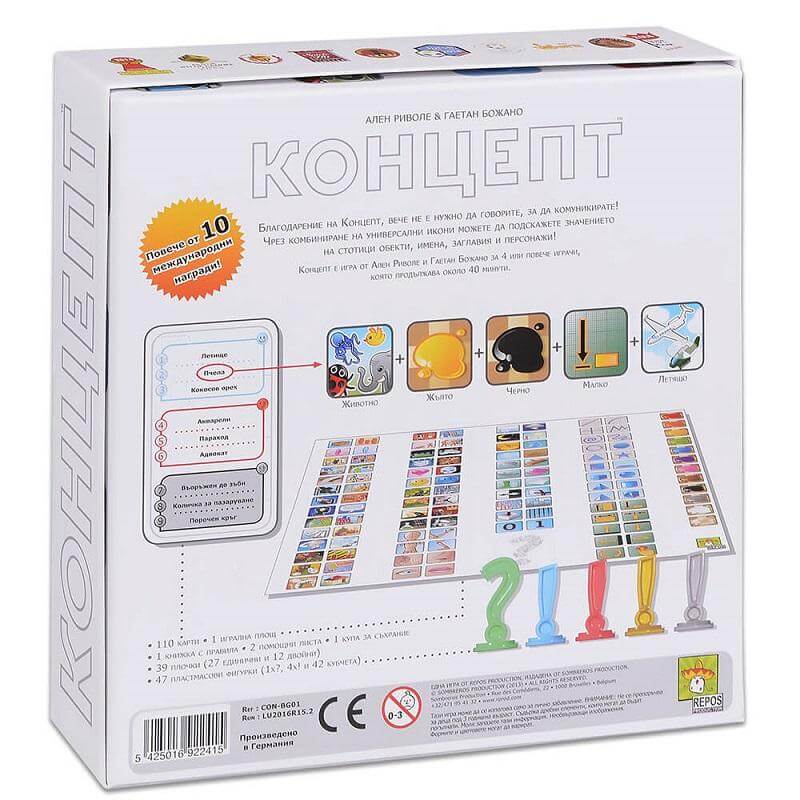 Концепт - настолна парти игра с карти за цялото семейство има за цел да познаете различните предмети с иконите, които са поставени пред теб. Отбор от двама играчи избират дума, която трябва да бъде позната от опонентите им. Например, ако думата е мляко, можете да поставите питанка на иконката за течност. Който познае получава по 2 точки. Победителят е с най-много точки. Концепт - настолна парти игра с карти за цялото семейство е забавна игра, която можете да играете навсякъде. Можете да разгледате останалите продукти от категорията "Настолни игри" ТУК!