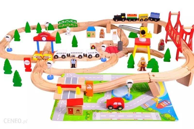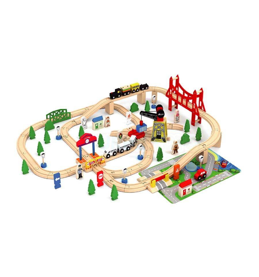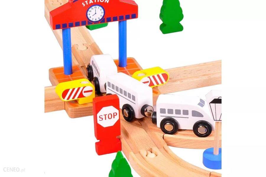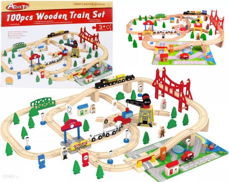 Дървено влакче с релси - 100 елемента Acool Toy. Комплектът се състои от: дървени релси; локомотиви и вагони с магнитно закрепване; въртящо се кръстовище с 8 изхода; бариери: гара; пътни знаци и светофари; дървени фигурки на хора и животни; надлез, сгради и лампи; дървета и храсти; цветно игрално поле; книжка с инструкции и описание на материалите. Играта с дървените влакчета развива логическото мислене, моториката и координацията на движенията. Освен всичко друго, при сглобяване на влакчето се развиват детската концентрацията, логическото мислене и въображението. Разгледайте още от категорията “Дървени влакчета” ТУК!!