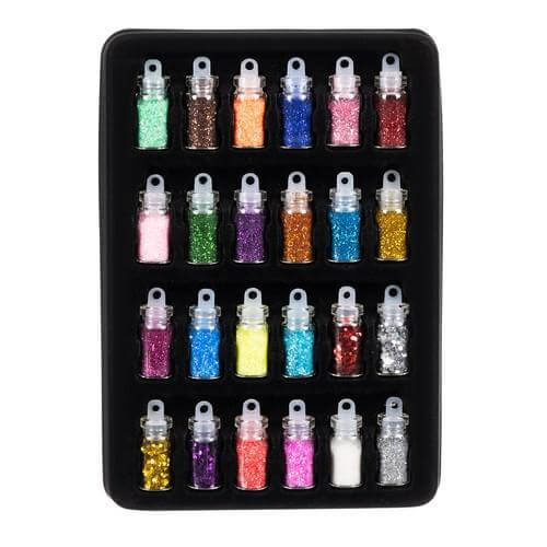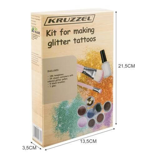 - блясъци: многоцветни - вместимост лепило: 10мл - брой шаблони: 186 бр - брой глитери: 24 бр - размери: 21,5 х 13,5 х 3,5 см - тегло: 254гр - тегло в опаковка: 290гр - ВКЛЮЧЕНО: 186 шаблона (5 листа), 24 заключващи се контейнера с блясък, 5 четки и 1 четка за татуировки, 1 лепило
