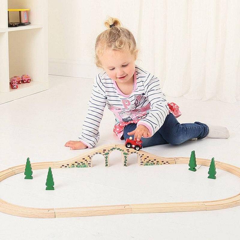 Дървен мост с арки за влакче Bigjigs Rail ще допълни всеки ЖП комплект за още по-забавна и реалистична игра. Той се състои от изкачващи се и слизащи релси, по които да се движи влакът, а под трите арки ще преминават колите. Дървен мост с арки за влакче Bigjigs Rail е съвместим с релсите и влаковете на повечето брандове. Изработката е от дърво, а боите са на водна основа и са напълно безвредни за децата. Посочената цена е за 1 брой. Разгледайте още продукти в категорията "Дървени влакчета" - ТУК! Комплектът съдържа: 2 части за сглобяване