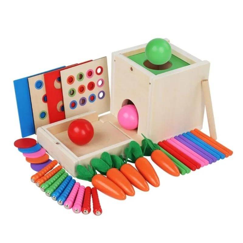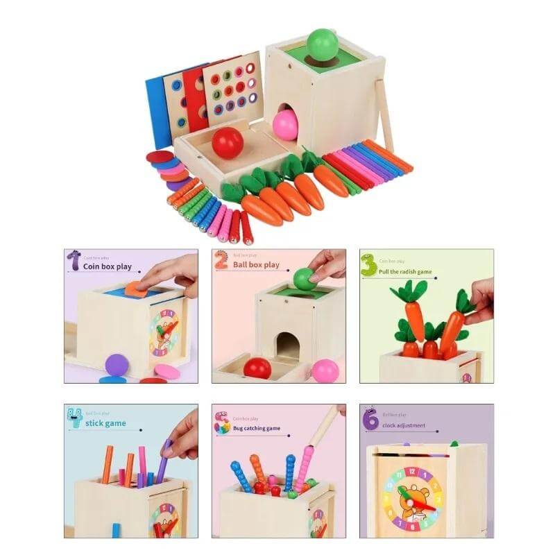 Детска дървена кутия с игри 5 в 1 Acool Toy. Горната част на чекмеджето разполага с отвор, в който могат да се вмъкнат четири различни шаблона: шаблон с дупка за пускане на топче; шаблон с прорез за пускане на жетони; шаблон с по-големи кръгли отвори за поставяне на морковчета; шаблон с по-малки кръгли отвори, предназначени за слагане на червейчета, които след това се ловят с въдица с магнитче; шаблон с малки отвори, където се поставят пръчици и се сортират по цветове. Всички тези елементи са включени в комплекта. Този продукт е вдъхновен от позитивните качества и идеи на Монтесори материалите. Дървените кутии помагат на бебето да координира движенията на ръцете и очите. Чрез поставянето на различните предмети в съответните места децата развиват моториката на ръцете, различните захвати и логическото мислене относно това къде трябва да се поставят предметите и какво ще се случи след това. Те стимулират изследването на причинно-следствената връзка при прости действия. Например, когато топчето или жетоните се пуснат в дупката и после излизат от друг отвор на друго място. Родителите могат да обяснят на децата, че това се случва, защото топчето е било пуснато през отвора на капака на кутията. Разгледайте още от категорията "Образователни играчки" ТУК!