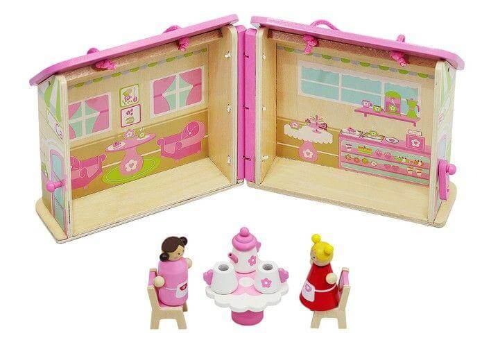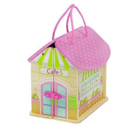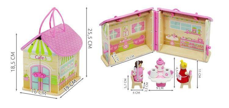 Дървена детска къща-кафене за кукли с аксесоари. Тази очарователна къща-кафене за игра ще предизвика много детски усмивки, гарантира невероятно забавление и позволява да се наслаждавате сами или с приятели. Тази весела и цветна къщичка ще помогне на децата да се пренесат във вълнуващия свят на въображението и ще им подари много весели часове, особено ако навън е дъждовно. Комплектът включва сгъваема къща-кафене и допълнителни аксесоари - фигури на жени, маса, столове, чайник и чаши. Играчката позволява разнообразни начини на игра и събужда силно детската креативност. Продуктът има атрактивен външен вид и здрава конструкция. Изработена е с голяма прецизност и е в пастелни, бонбонени цветове. Сладкият дизайн превръща продукта и в чудесен аксесоар за детското помещение. Куклената къща е лека и има удобен, практичен размер. Специалната дръжка позволява продукта лесно да се пренесе от едно на друго място. Разгледайте още продукти в категорията “Къщи за кукли и принадлежности” – ТУК!