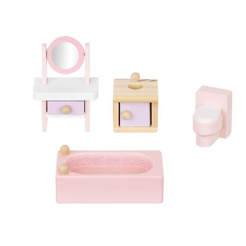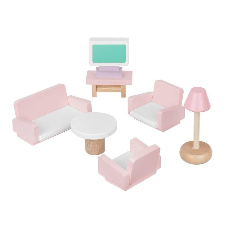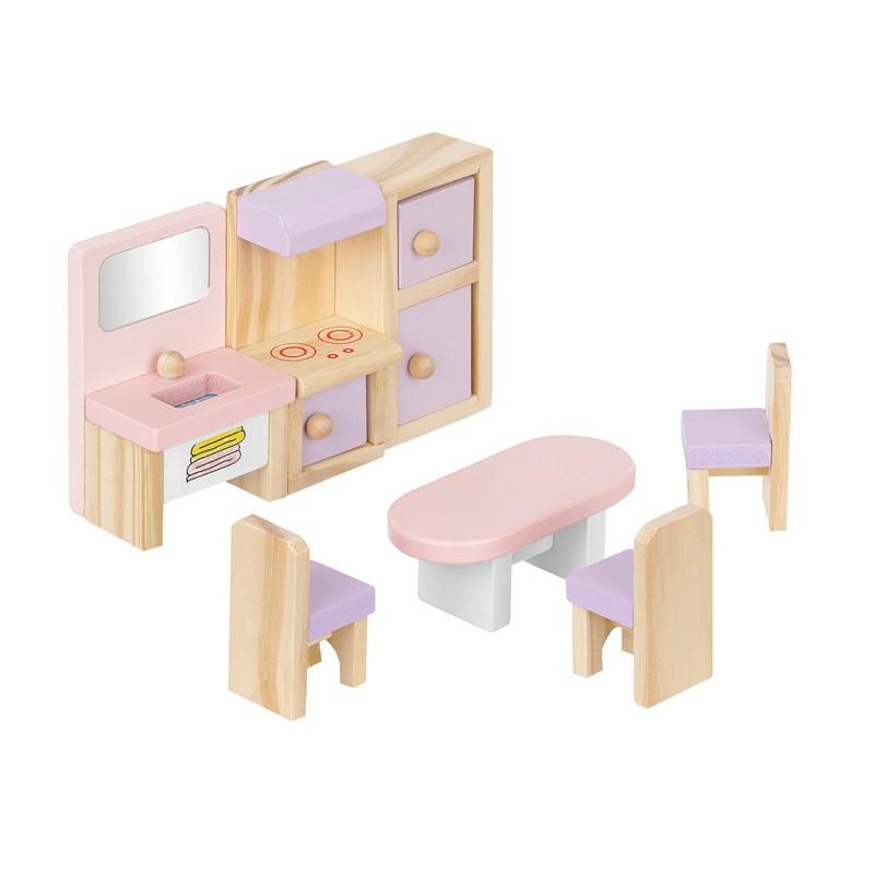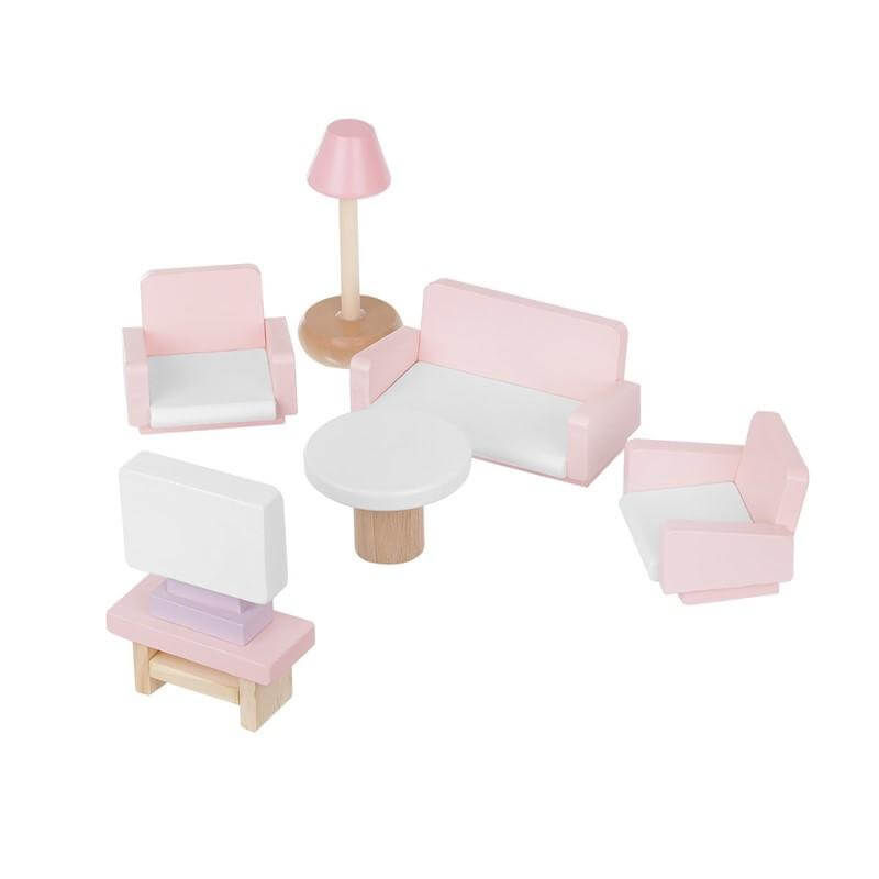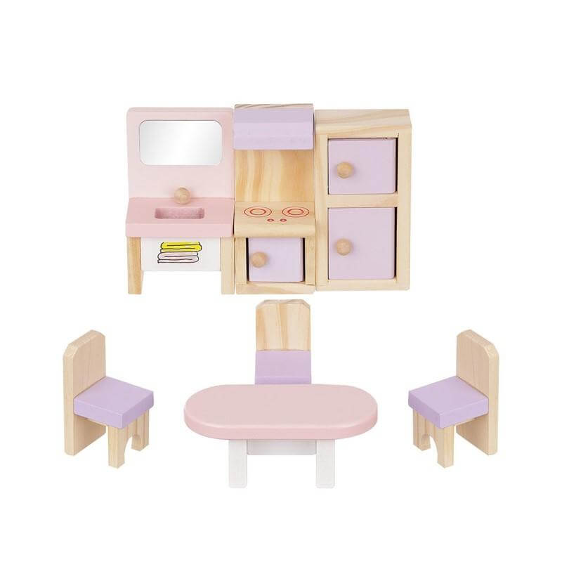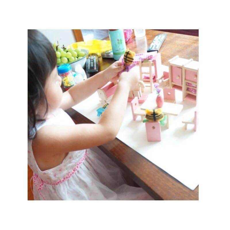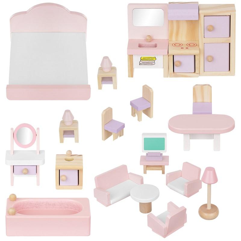 Обзавеждане за детска куклена къща от 22 части! Мебелите са изработени прецизно и естетически, а играта с тях е истинско удоволствие за всяка малка дама, която обича да имитира майка си - обзавеждането на къщата ѝ помага да свикне с ежедневието и да следва правилата за придобиване на социално поведение. Играчката не само дава възможност за голямо забавление, но също така влияе върху интелектуалното развитие на детето и увеличава неговите двигателни способности. Развива въображението и стимулира креативността, учи на групови занимания и подобрява сoциалните умения. Комплектът е идеален за самостоятелна игра, игри с възрастни или с други деца. Комплектът се състои от дървени мебели за кухня, хол, спалня, баня и трапезария. Мебелите в хола включват: диван, два фотьойла, лампа и масичка за кафе. В банята можем да поставим: вана, мивка с огледало и тоалетна седалка. Кухнята може да бъде оборудвана с: хладилник, фурна с капак, шкаф с мивка и голяма библиотека, а в трапезарията ще има голяма маса с четири стола. Шкафовете, хладилникът и другите мебели имат подвижни елементи, които придават реализъм на играта. Класическата красота на дървото и неговата издръжливост винаги са го правили високо ценени. Обзавеждане за детска куклена къща от 22 части е страхотен избор за подарък! Посочената цена е за 1 брой. Разгледайте още продукти в категорията "Къщи за кукли и принадлежности" - ТУК! Комплектът съдържа: 22 мебели и аксесоари.