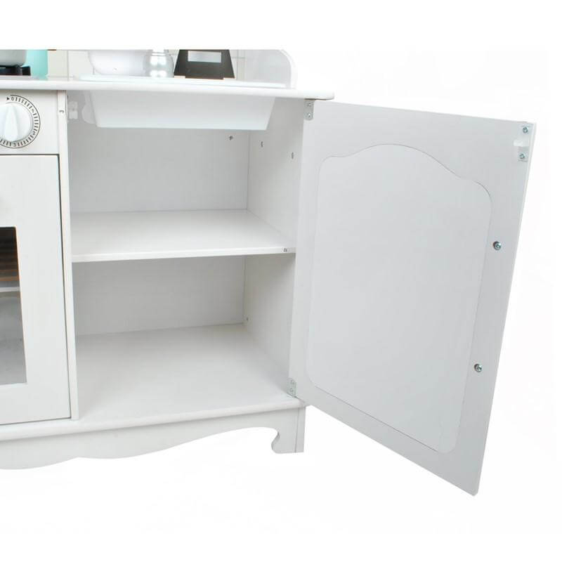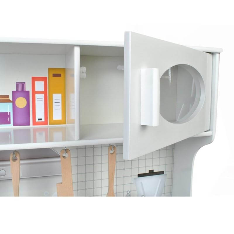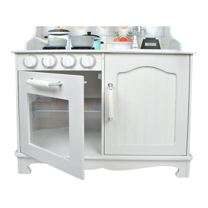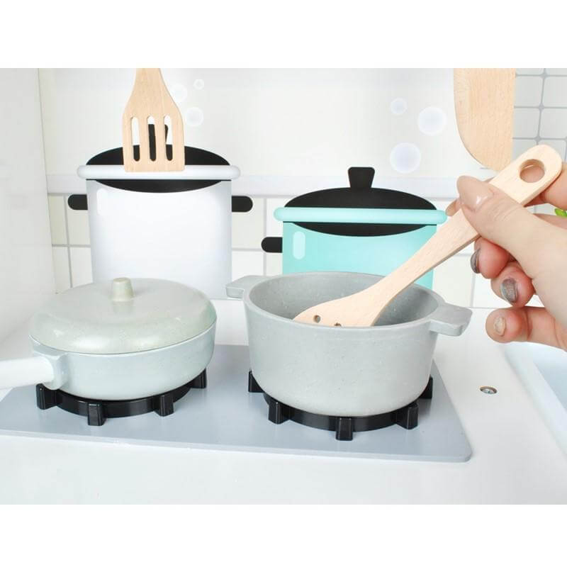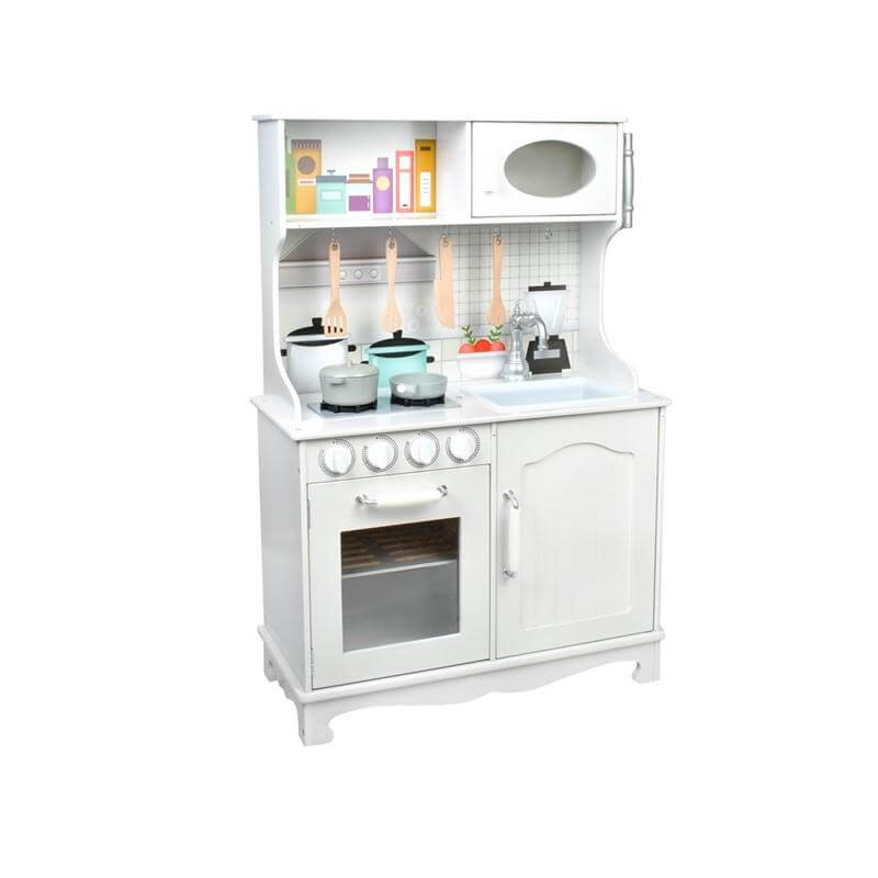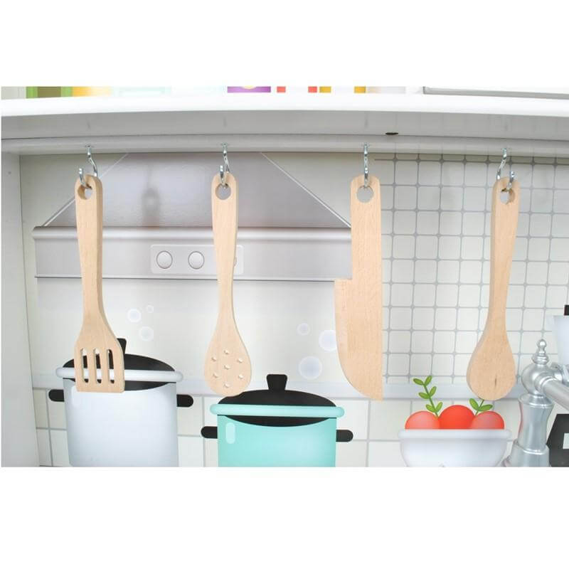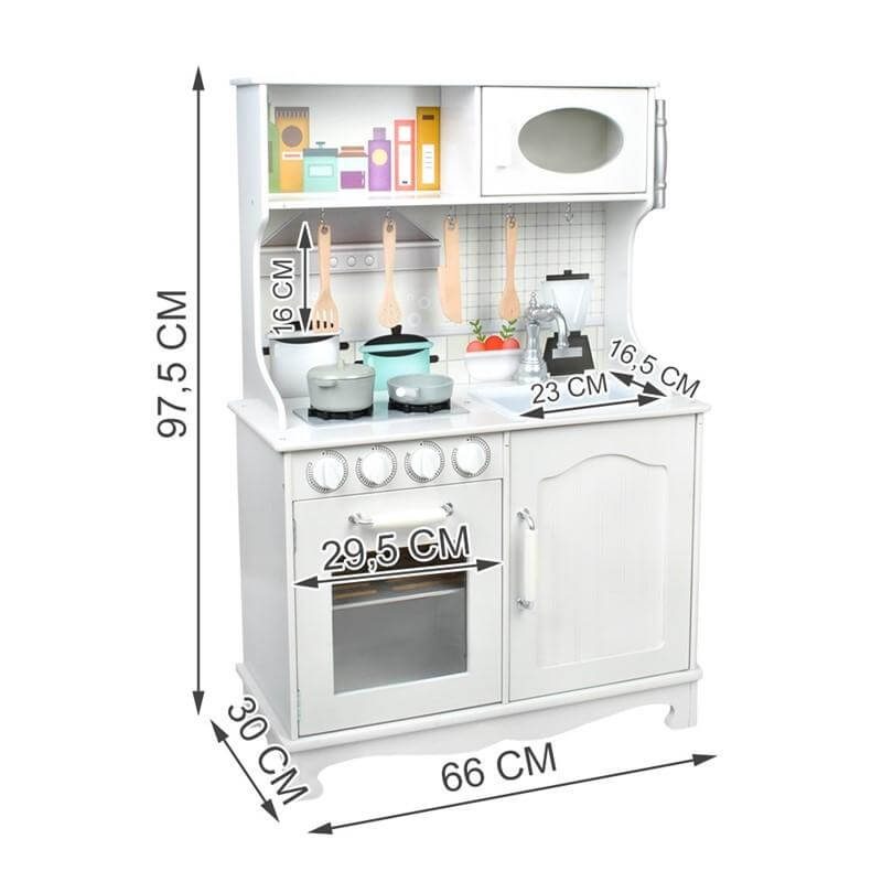 Чудесна дървена детска кухня, която обещава незабравима и забавна игра. Тя разполага с всичко, от което се нуждае кухнята на малкия готвач - мивка, фурна, котлони и изключително реалистична микровълнова фурна. Завъртайки ключовете на котлоните, те ще издават кликащ звук. Шкафът на кухнята е много просторен, като ще събере всички кухненски аксесоари. В комплекта ще откриете тенджера, тиган и 4 дървени прибора за хранене. Игрите с дървена детска кухня са полезни за сръчността, ролевата игра и въображението на децата. Изработката на кухнята е от висококачествени и напълно безвредни материали. Посочената цена е за 1 брой. Разгледайте още продукти в категорията "Дървени детски кухни и аксесоари" - ТУК! Комплектът съдържа: кухня, тиган, тенджера и 4 прибора за готвене.