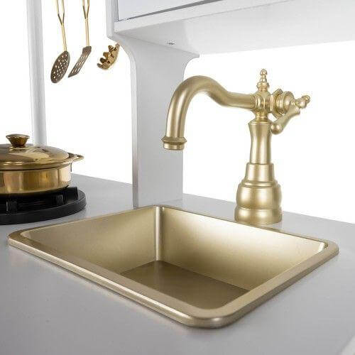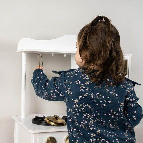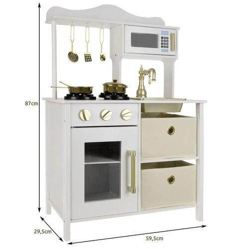 Модерна дървена кухня за игра с аксесоари бял и златист цвят Kruzzel. Кухнята се предлага с LED лампа, която може да се постави под шкафа, в шкафа или във фурната - изборът е ваш! Осветлението ще накара детето да се почувства като в истинска кухня, като ефектът ще е още по-голям, когато стаята е тъмна, а лампата ще позволи на детето да приготви вечеря за куклите, мечето или родителите си . Освен това, горелките в печката издават щракащ звук, когато завъртите копчетата! Вашето дете ще бъде във възторг - кухнята ще позволи много часове забавление. Добавяме ги към комплекта 4 лъжици: черпак, лъжица за спагети, решетъчна лъжица и лъжица за паста; тенджера, тиган и капак. Мивката в печката е подвижна, детето/родителят може да я напълни с вода и да измие "мръсните" чинии след игра. Печката е изработена от висококачествена дървесина, което значително влияе върху продължителността на нейното използване и безопасността и здравето на децата. Това е вечно предложение, което ще зарадва всяко дете. Благодарение на класическия си вид, той винаги се е радвал на голяма популярност. Изключително внимателна изработка с естетичен завършек и внимание към най-малките детайли добавя стойност и радва окото. Кухнята може успешно да изпълни и декоративна функция и да украси детска стая. Ролевите игри не само осигуряват забавление, но и развиват въображението и стимулират творческото мислене, учат на групово сътрудничество и подобряват социалните и интеграционни умения. Повишава ръчните и актьорските умения, а също така може да се превърне във вдъхновение и да допринесе за успеха на бъдещ готвач. Децата са естествено любопитни към света и обичат да имитират другите. Те учат чрез наблюдение и игра. Дървената кухня е фантастичен начин за прекарване на времето по атрактивен начин за деца, които обичат да си играят на къщи и да приготвят храна. Ще ви позволи да играете роли от най-ранна възраст и ще има образователна функция. Продуктът е чудесна идея за прогонване на скуката, особено когато времето навън е лошо. Дървената кухня играчка има модерен, модерен външен вид, който ще бъде оценен от всеки подрастващ готвач. Има имитация на две горелки, на които можете да готвите вкусни ястия. След като завъртите копчетата, ще чуете характерно щракване. След като приключите с храненето, все още трябва да измиете чиниите с помощта на мивката. Готвенето се подпомага от светеща лампа, благодарение на която можете да приготвяте вкусни ястия дори късно вечер. Играчката има подвижни елементи като вратички и копчета, които й придават реализъм. Той е много популярен сред момичетата, но благодарение на универсалните си цветове е идеален и за момчета. Разгледайте още продукти в категорията "Детски дървени кухни и аксесоари" - ТУК!