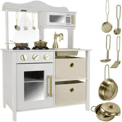 Характеристики на продукта Модерна дървена кухня за игра с аксесоари бял и златист цвят Kruzzel: