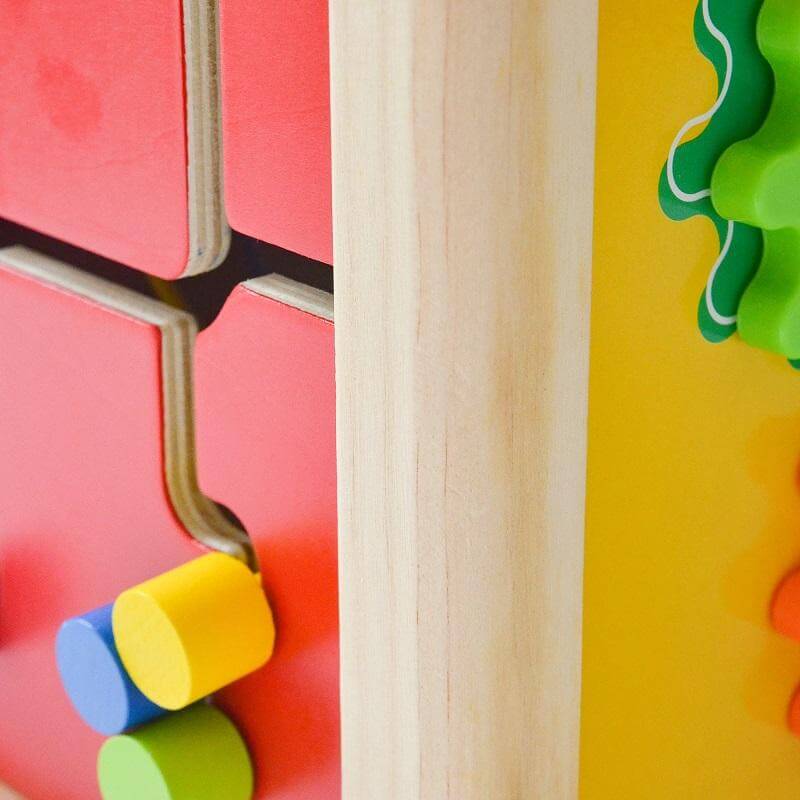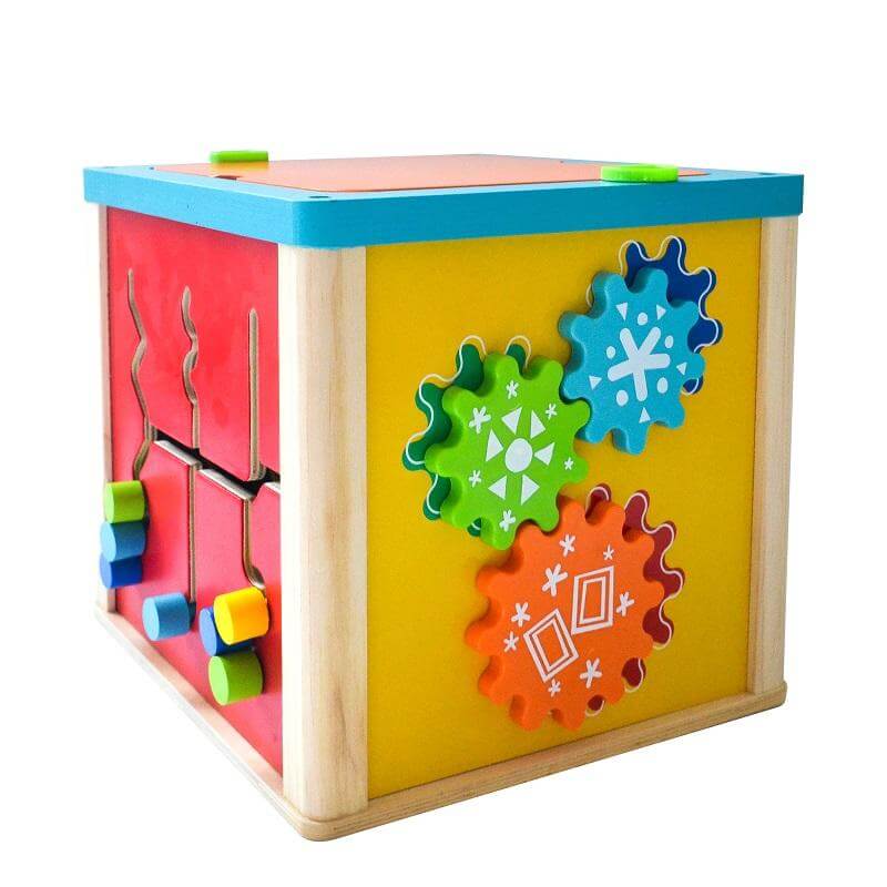 Дървена детска играчка - куб Acool Toy. Многофункционалнен дървен куб с няколко любими детски занимания: поставяне на геометрични фигури в съответните им дупки; игра със зъбни колелета: лабиринт с топчета; часовник; пътечки за проследяване. Дървената игра развива моториката на ръцете, логиката и координацията на детето, а също така търпението, вниманието и концентрацията му. Разгледайте още от категорията "Монтесори играчки" ТУК!