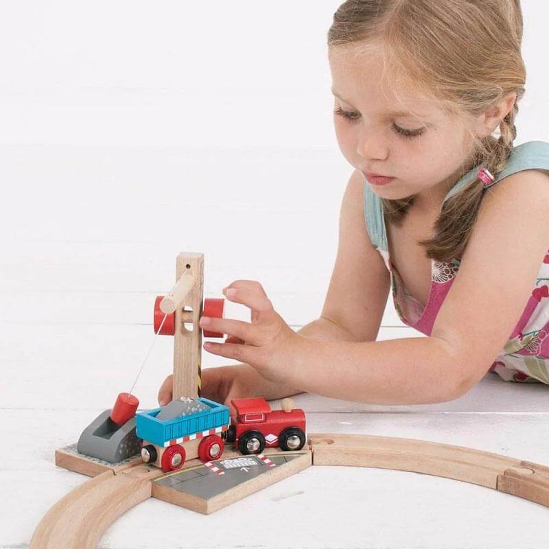 Комплект за дървена железница Дървен кран за чакъл Bigjigs. Превърнете вашата дървена железница в работеща железопътна мрежа! Нашата реалистична играчка кран с чакъл се предлага с напълно функционираща макара и представлява още един вълнуващ елемент към дървен комплект влакове. Магнитната макара на работещия кран позволява товарът от чакъл да бъде повдигнат и натоварен върху каретата, готова за транспортиране. Това е перфектният аксесоар за дървени влакове за ентусиастите на мини железниците и е специален подарък. Образователна и забавна, тази детска играчка кран има безкраен обхват за ролеви сценарии. Повечето други големи марки дървени железопътни линии са съвместими с Bigjigs Rail. Изработен от висококачествени материали с отговорни източници. Отговаря на настоящите европейски стандарти за безопасност. Разгледайте още продукти в категорията "Дървени влакчета" - ТУК!