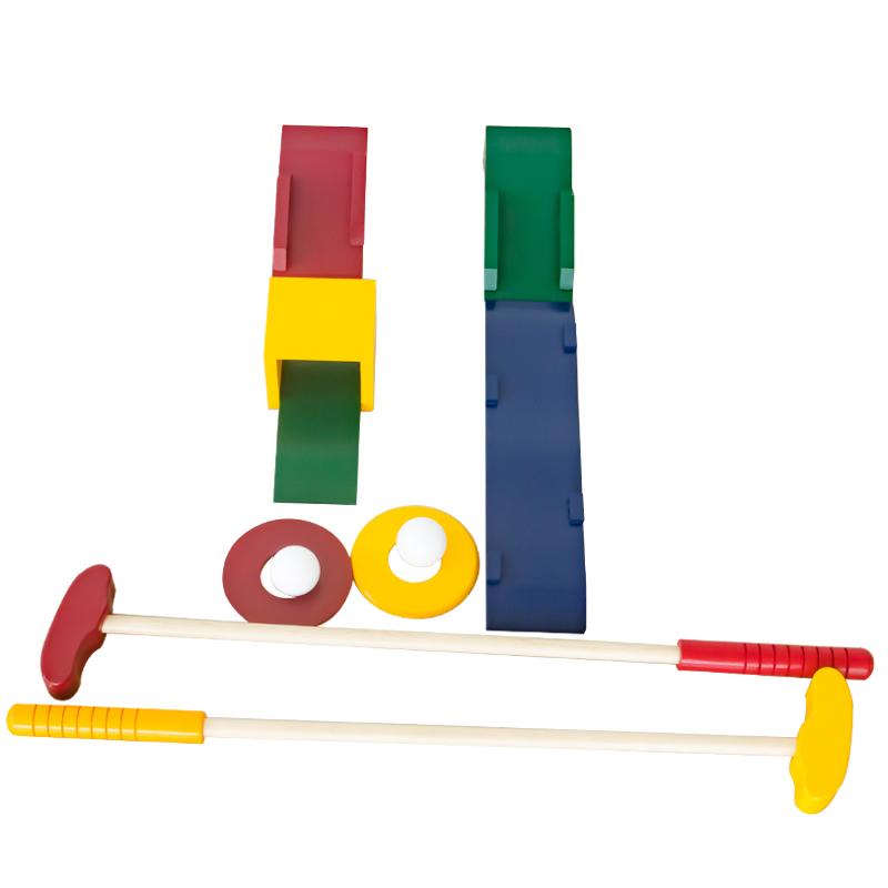 Дървен голф за деца с препядствия Acool Toy. Дървеният детски голф е забавна и интересна игра, която предлага на децата уникални преживявания и предизвикателства. В комплекта на играта се съдържат различни елементи, които позволяват на децата да създадат собствено игрово преживяване и да развиват своите двигателни умения и координация. В комплекта на детския голф са включени два дървени стика, специално проектирани и изработени съобразно детските ръчички. Това ги прави лесни за употреба от страна на децата и дава възможност за удобен захват и управление. Два топчета са също включени в комплекта, които допринасят за забавлението и практиката на точността на удара. Важна част от комплекта са и четири различни препятствия, които децата могат да нареждат последователно или да използват самостоятелно, за да създадат уникално и предизвикателно трасе за играта. Това насърчава техните творчески умения и въображение, като ги предизвиква да създадат различни комбинации и аранжименти на игровите препятствия. В допълнение, комплектът включва две кръгчета с дупка, които могат да служат като своеобразен финал на играта. Постигането на точността при удара и попадането на топчето в дупката е стимулираща и вълнуваща част от играта. Заниманията с дървения детски голф също така са изключително полезни за развитието на децата. Чрез играта, те развиват своята координация на движенията, както и двигателните си умения, като усъвършенстват своята сръчност и точност. Освен това, играта насърчава децата да се концентрират и фокусират върху дадена задача, като по този начин развиват своите когнитивни способности. Колективните игри като дървения детски голф са прекрасен начин за забавление и веселие както за малки, така и за големи. Те създават вълнуващи и забавни моменти за споделяне и игра с приятели и семейство. Играта е подходяща за игра както вътре в дома, така и на открито. Това прави дървения детски голф изключително универсална играчка, която може да бъде наслаждавана навсякъде и по всяко време. Заниманията с този продукт са подходящи за деца над 3 години, което гарантира, че децата вече имат достатъчно развити двигателни умения и сръчност, за да се насладят на играта и да се възползват от предизвикателствата, които тя предлага. Разгледайте още продукти в категорията “Играчки за навън” – ТУК!