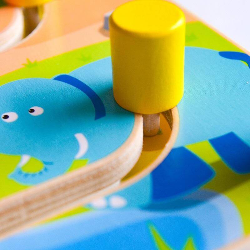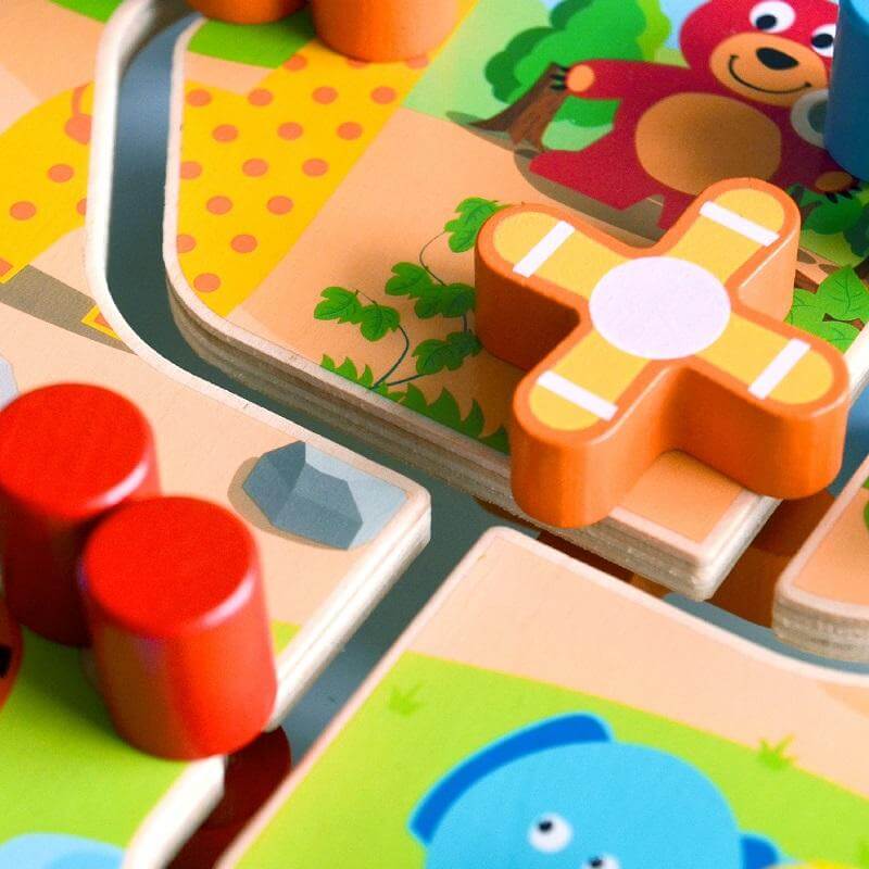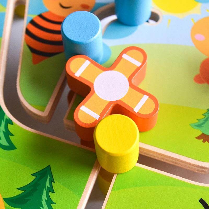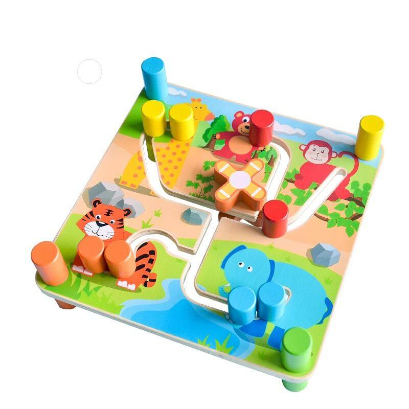 Лабиринт с улеи и животни Acool Toy. Играчката представлява двустранна шарена дъска с крачета. В дъската са изрязани улеи, по които се движат дървени мъниста. Целта е всяко мънисто да отиде при съответния цвят животинче. Чрез заниманията с този дървена дъска за игра у децата се развива фината моторика на пръстите и подготовката на пръстите за държане на молив или химикал. Освен това помага за научаването на цветовете по лесен и забавен начин, а също така и подобрява координацията между ръцете и очите, концентрацията и логическото мислене. Разгледайте още от категорията "Дървени пъзели" ТУК!