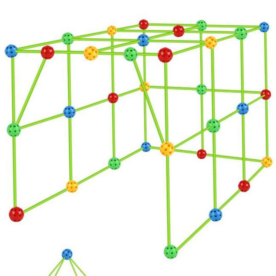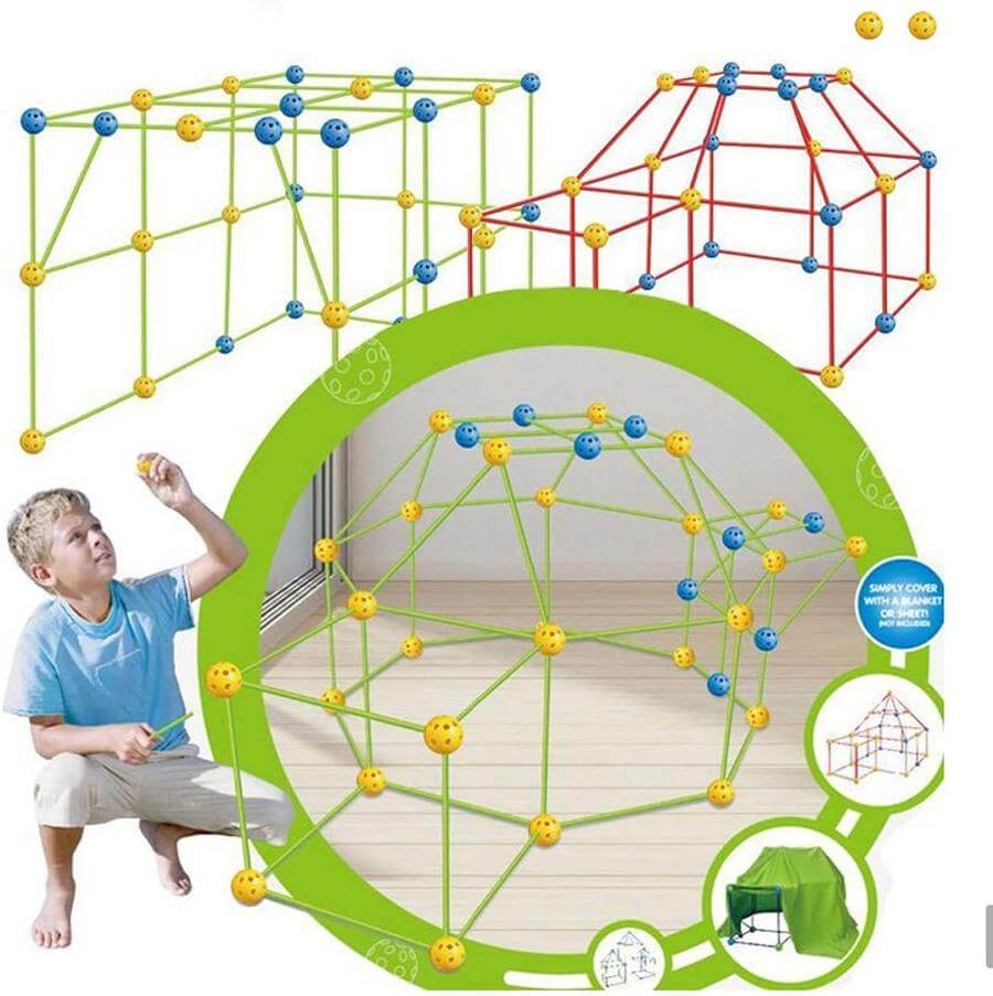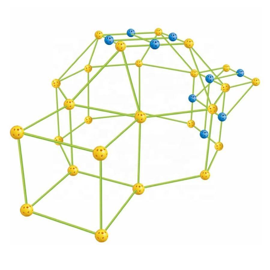 Детско сглобяемо леговище - Направи си сам Acool Toy. Играта се състои от: 51 пръчици; 36 топчици; 1 платнище; упътване с различни модели леговища. С играта "built your own den", детето се запознава с 3D измерните форми и развива фината моторика и координацията си, както и креативност и пространствено мислене. Всяка топка за сглобяване е снабдена с отвори, позволяващи сглобяването на пръчките под различен ъгъл, като по този начин позволява направата на разнообразни конструкции. Разгледайте още от категорията “Детски къщички за игра” ТУК!
