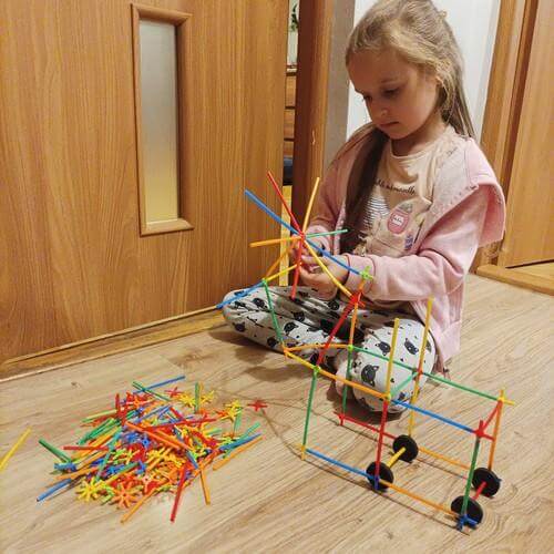 Сламки за сглобяване комплект 238 бр. Kruzzel 22416. Комплектът включва 120 цветни сламки, 114 конектора и 4 ринга от пяна, което ви позволява да реализирате почти безброй проекти. Включените в комплекта колела ще ви позволят да разнообразите структурата, напр. създавайте превозни средства, колички и др. КОМПЛЕКТЪТ ИМА ЗА ИГРА И УЧИ - блокчетата влияят върху развитието на детето, развиват ръчните умения и стимулират въображението, като същевременно доставят много забавление на малкото дете. Докато играе, детето упражнява и концентрация и зрителна координация. АТРАКТИВНИ ЦВЕТОВЕ - сламките се изработват в 5 цвята: червено, оранжево, синьо, зелено, жълто, благодарение на което можете да създавате интересни конструкции от сегменти с еднакви цветове, цели творения в един цвят или многоцветни дизайни. ИДЕЯ ЗА ПОДАРЪК - комплект блокчета също е чудесна идея за подарък, опаковката включва няколко примерни конструкции, които можете да направите с помощта на сламките, включени в комплекта. Разгледайте още продукти в категорията “Сглобяеми играчки” – ТУК!