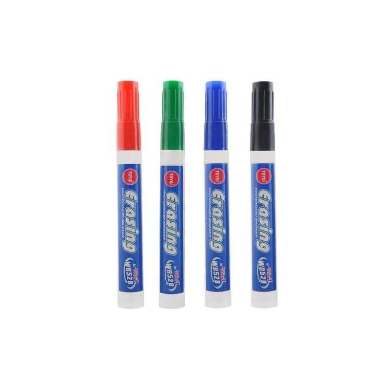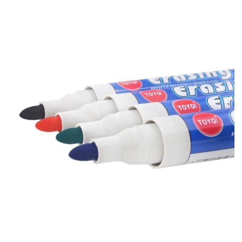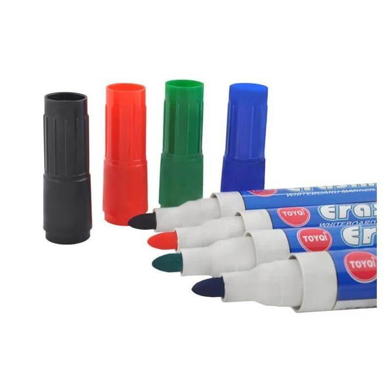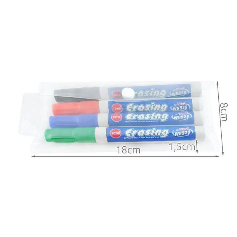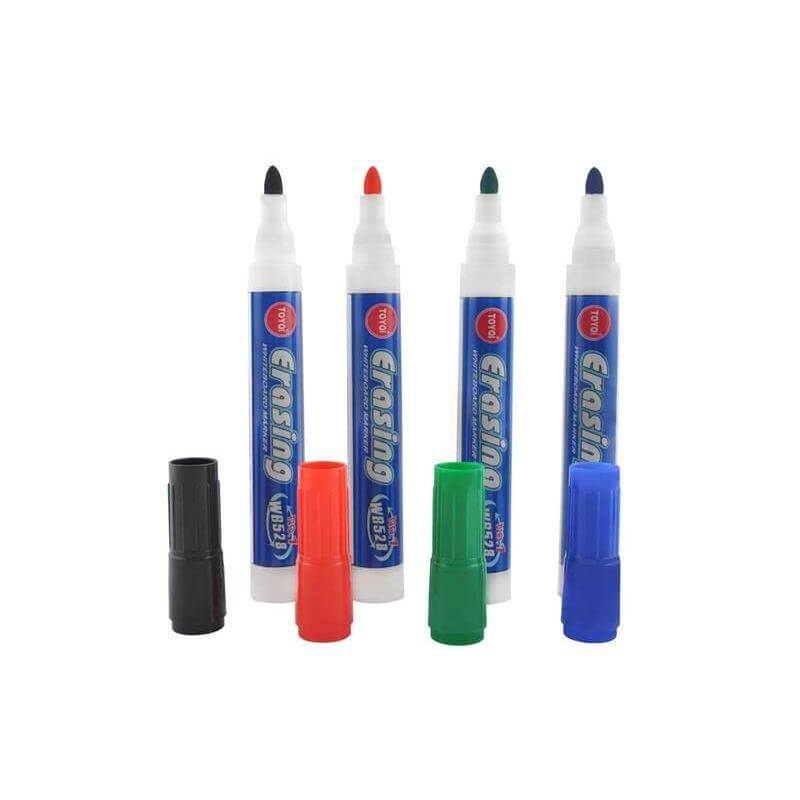 Маркери за бяла дъска - 4 цвята, удобни, бързосъхнещи. Лесно се отстраняват от повърхността на дъската, не оставят постоянни, нежелани следи. Маркери за бяла дъска - 4 цвята са предназначени за бяла дъска със сухо изтриване, но могат да се използват и на други повърхности, като например фолио или стъкло. Дебелината на линиите е 2,8 мм. Посочената цена е за 1 брой. Разгледайте още продукти в категорията "Творчески комплекти" - ТУК! Комплектът Маркери за бяла дъска - 4 цвята включва: 4 маркера с различни цветове - черно, синьо, червено и зелено.