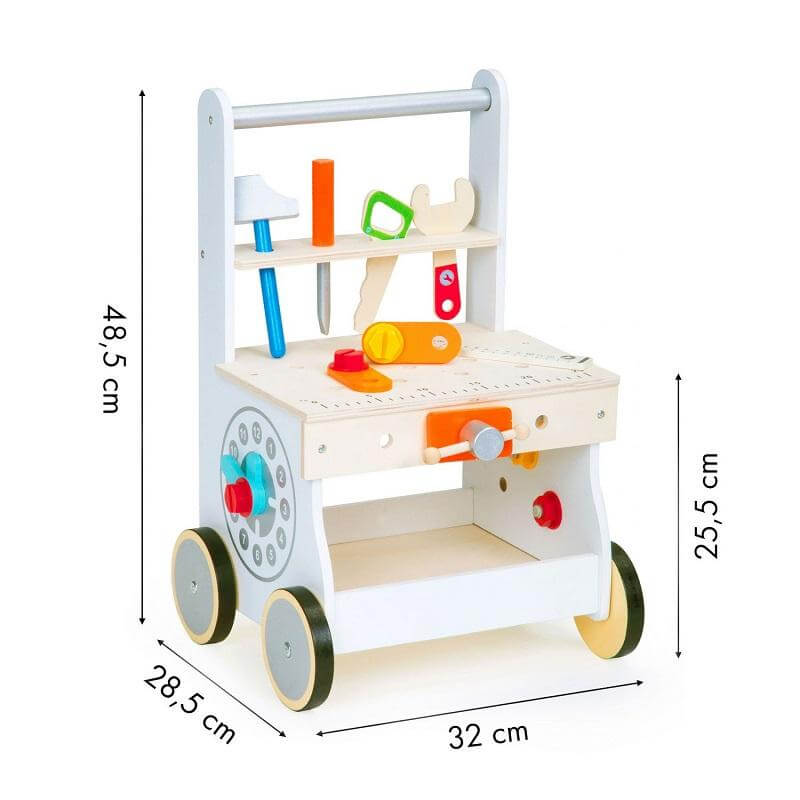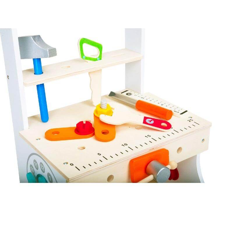 Дървена работилница с инструменти Ecotoys ще подари часове наред приятни занимания. Тя е подвижна и може да се пренася на различни места. С нея можете да извършвате различни функции, които ще насърчат сръчността и фината моторика на детето. Заниманията на детето ще насърчат въобаржението и сръчността. Дървена работилница с инструменти Ecotoys ще даде основни познания на малчуганите и ще ги запознае с основните инструменти. Сред тях са чук, гаечен ключ, отвертка и трион, както и ролетка и няколко елемента за усукване. В долната част на масата има пространство, където можете да сложите да приберете инструментите или да добавите други принадлежности. Разгледайте останалите продукти от категорията "Детски инструменти" ТУК!