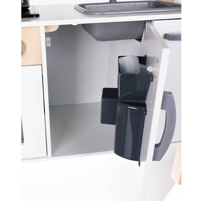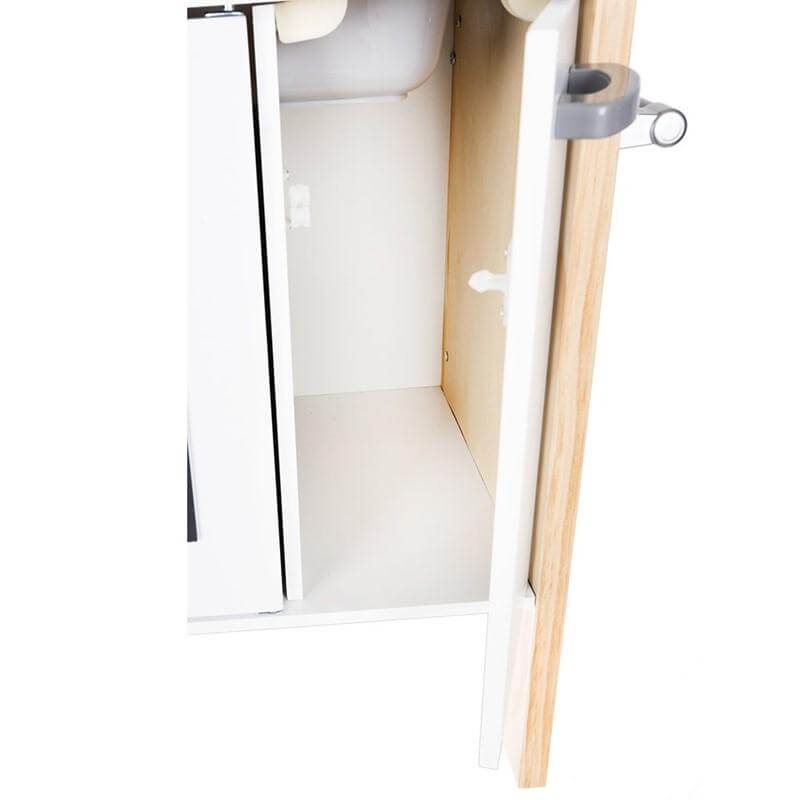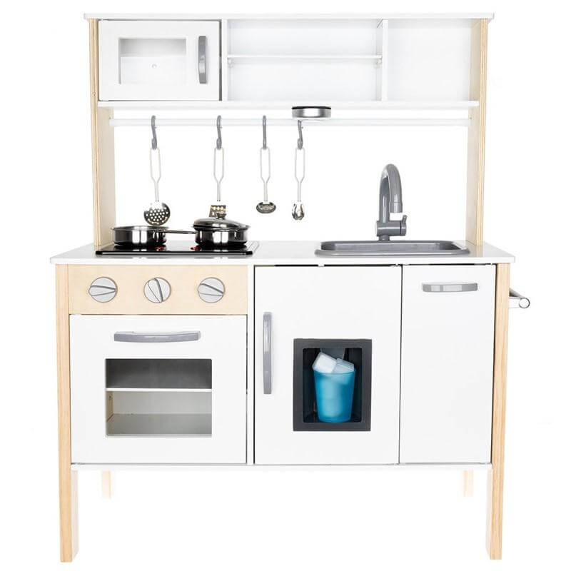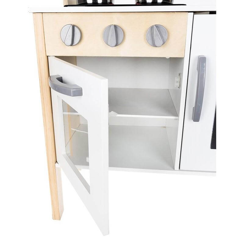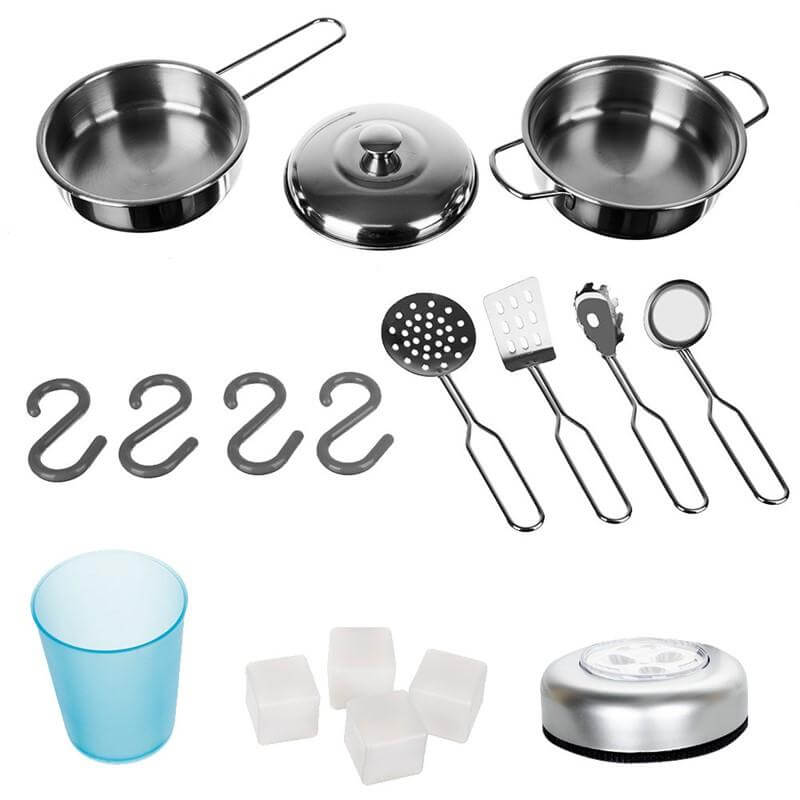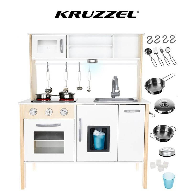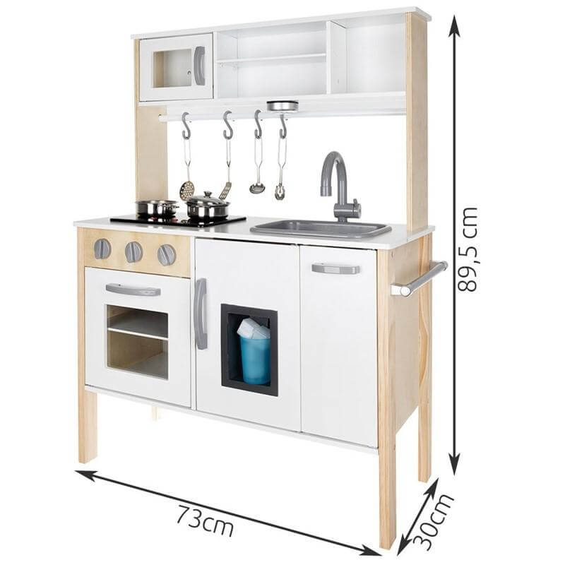Детска дървена бяла кухня със светлина и съдове е вече тук! Малките готвачи с радост ще готвят в своята оборудвана кухня, докато стимулират ролевата си игра и въображението. В нея те ще намерят хладилник, който пуска ледчета, фурна и отварящи се шкафчета, както и котлони с въртящи се ключове, издаващи кликащ звук. Кухнята разполага и с лампа, която ще свети на готвачите, ако готвят на тъмно. В комплекта има метални съдове за готвене. Детска дървена бяла кухня със светлина и съдове е боядисана с безвредни бои, като е подходяща за момичета и момчета, защото е в неутрален бял цвят. Посочената цена е за 1 брой. Разгледайте още продукти в категорията "Дървени детски кухни и аксесоари" - ТУК! Комплектът съдържа: оборудвана кухня, съдове за готвене, лампа и други. Размери: 89,5 см - височина 73 см - ширина 30 см - дълбочина
