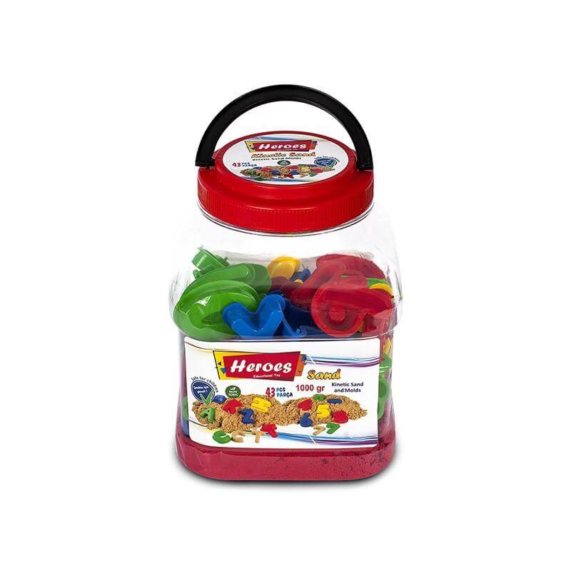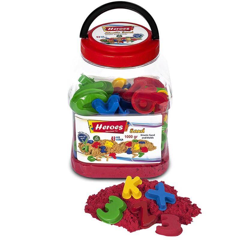 Кофа червен цвят кинетичен пясък 1000 грама с 43 броя фигурки цифри и букви