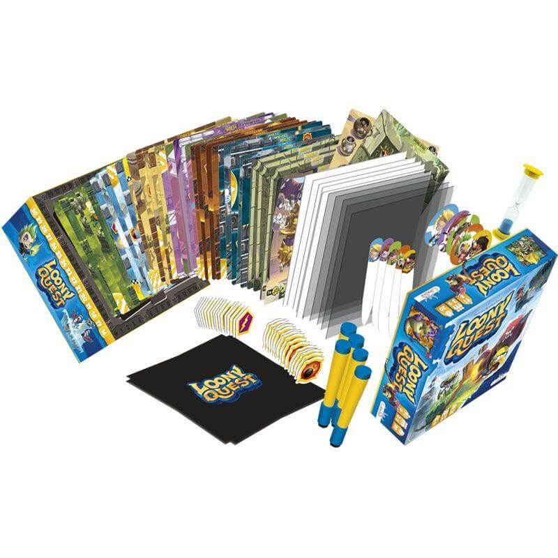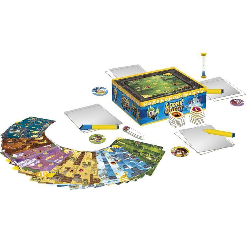 Loony Quest - настолна парти семейна игра с карти е интересна игра. В нея ще се запознаете с кралство Аркадия и крал Фидор, който няма деца и остава без наследник. Той организира турнир. Победителят ще наследи трона. Състезателите трябва да посетят 7 митични свята, които обитавани от  Loonies - същества, които не се дават без бой. Освен за тях, съперниците трябва да внимават и да се пазят един от друг. Състезателите трябва да прекосят световете, които се състоят от 6 нива, с изключение на последния. Минавайки през тях, те трупат точки, а финала се срещат със страховития Бос. Играчите са оборудвани с маркер и екран. На екрана трябва да отбележат маршрута си. По пътя си те трябва да се пазят от съществата, защото могат да загубят точки. Също така, имат възможност и да поставят капани на своите опоненти. Loony Quest - настолна парти семейна игра с карти ще развие стратегическото мислене и съобразителността по забавен и интересен начин. Можете да разгледате останалите предложения от категорията "Настолни игри" ТУК!