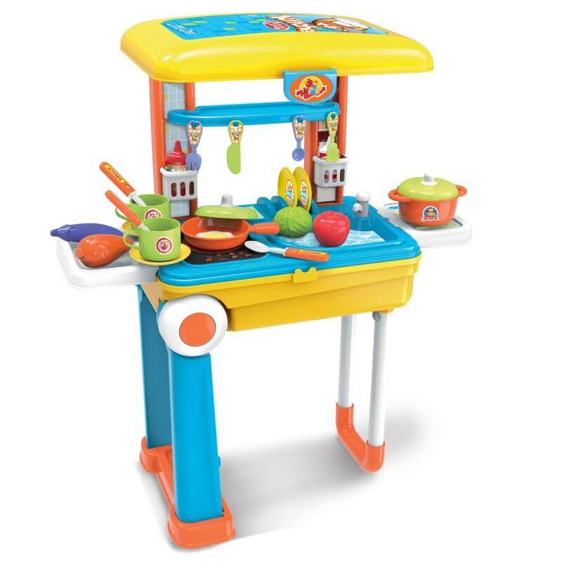 Голяма детска кухня Buba Little Chef Set - Жълта/Синя е това, от което се нуждае всеки малък готвач. Кухнята има свой куфар за транспортиране и така лесно можете да я преместите от едно място на друго. Също толкова лесно се и сглобява, като можете дори вие да участвате в игрите с детето. Заниманията с кухнята ще развият фината моторика, въображение и креативността. Голяма детска кухня Buba Little Chef Set - Жълта/Синя се състои от котлончета, изкуствена храна и всичко необходимо за една кухня. С нея детето ще бъде истински готвач, ще научи различните продукти и ще направи свои ястия. Можете да разгледате останалите продукти от категорията “Пластмасови детски кухни за игра” ТУК!