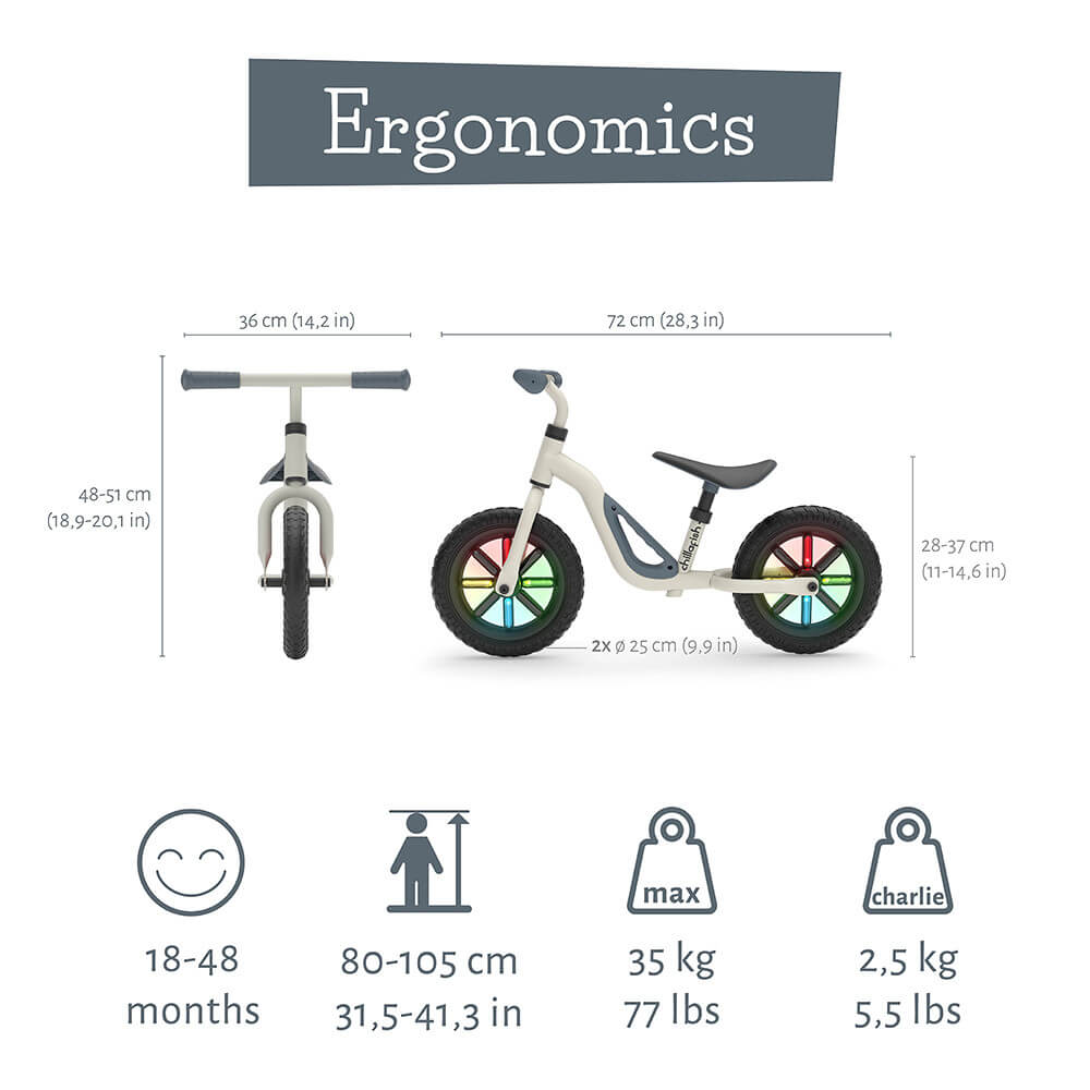 CHARLIE моят първи баланс байк 10" колело за балансиране с дръжка за носене ! charlie в детската стая Чарли, 10-инчов балан байк с интегрирана дръжка за носене, изключително лек. Супер-чист свеж дизайн със забавни стикери :-) Регулируема височина на седалката и кормилото; расте с вашето дете. Имате нужда от още нещо? Какво ще кажете за персонализирана удобна седалка Chillafish и 10" EVA гуми, които няма нужда да надувате, никога! charlie В кухнята От първите скици до този сладък 10 " колело за балансиране ... добавихме страхотни спецификации и функции в този страхотен дизайн. В Chillafish ние не вземаме готов продукт, който да преправим, за да изглежда като продукт на Chillafish. Ние проектираме от бял лист хартия и започваме от нулата. Ето защо Чарли изглежда толкова много различен от всичко на пазара. CHARLIE ВЕЧЕ СВЕТИ Новият Charlie GLOW има LED светещи спици. Те нямат нужда от допълнително захранване- само се движете! Колкото по бързо се движите, толкова по-ярко ще свети Charlie GLOW. Нови 3 страхотни цвята! Charlie В Гаража&...