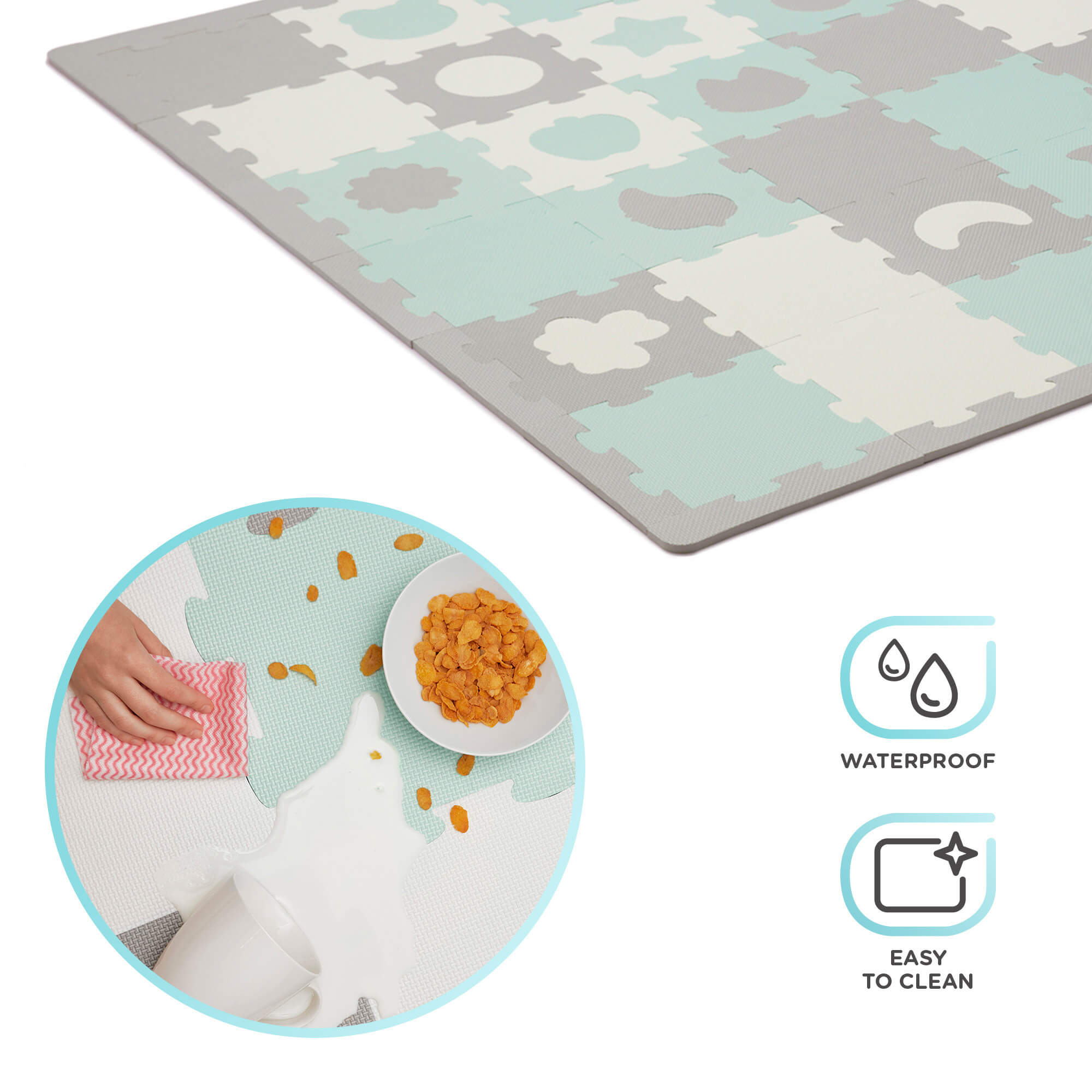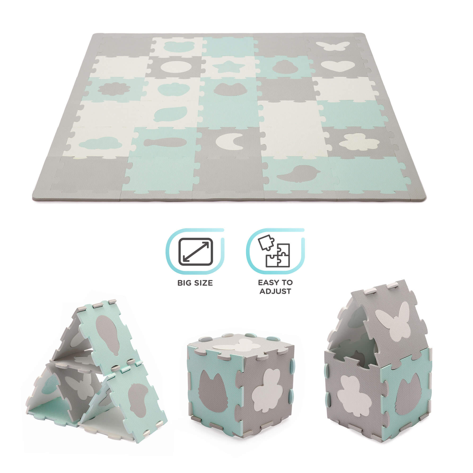Мултифункционален пъзел килим за игра LUNO е идеалната основа за лежане, игра, пълзене и първи стъпки! Благодарение на най-високата дебелина на пазара и специалните материали, LUNO предпазва вашето дете от падане и осигурява на детето оптимална топлоизолация. Големият брой пъзел плочки ви позволява да разпръснете постелката върху по-голяма площ, за да си осигурите страхотно забавление без излишна бъркотия. Без вредни вещества Безопасността на вашето дете е много важна! Мекият пъзел за игра LUNO има всички необходими сертификати и е изработен от материали, които нямат отрицателно въздействие върху здравето на вашето дете и семейството ви. Водоустойчив и без вредни вещества LUNO гарантира, че вашето малко дете се забавлява, докато вие имате момент за себе си. Не е нужно да се притеснявате за безопасността на детето или... състоянието на пода. Постелката осигурява защита срещу петна от течност и храна, като ги задържа върху повърхността от пяна. Просто избършете с кърпа и можете да се върнете към играта. Развива детското въображение LUNO може да се сглобяв