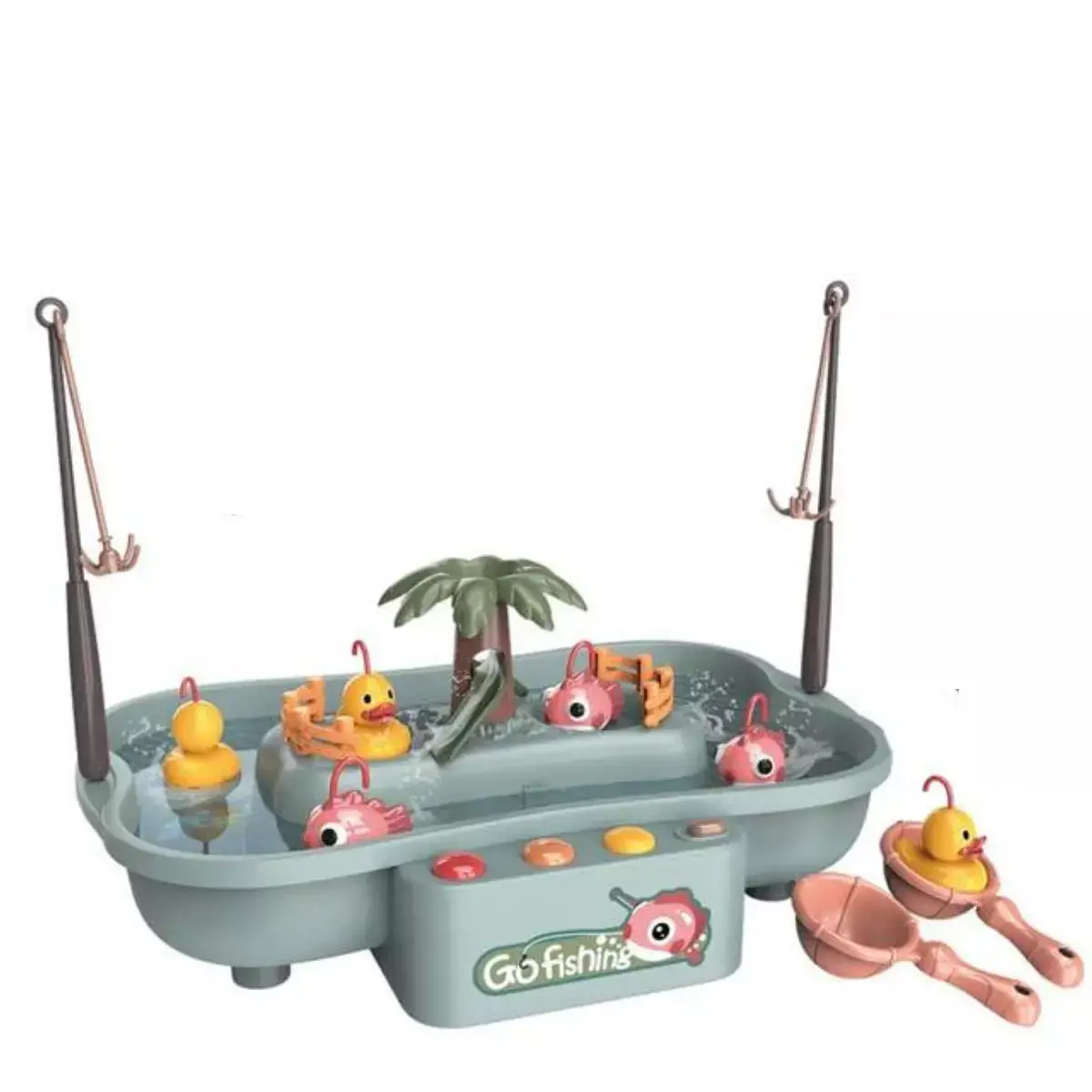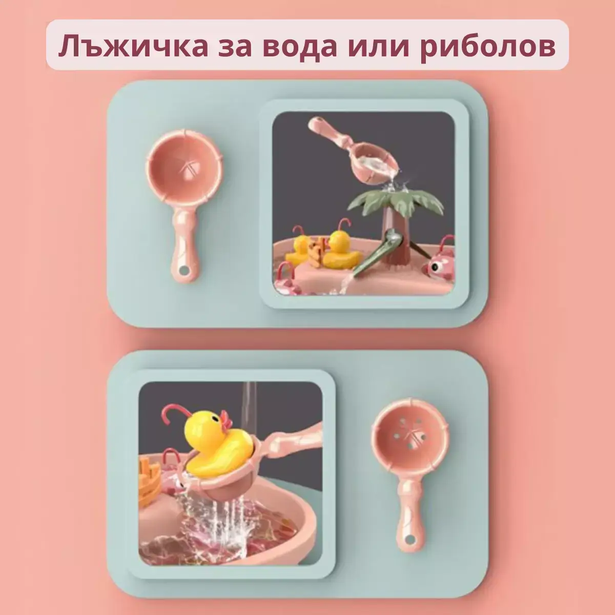 Запознайте се с по-добрата версия на класическата игра за риболов! Още по-вълнуваща от всякога! Работи с вода! Играта спомага за развитието на фината моторика, тренира координацията око-ръка. В допълнение, помага за упражняване комуникационни умения. Комплектът включва: Езеро и аксесоари– растения, стикери за езерото, патета и рибки, 2 въдици и др. Поставете батерията, напълнете вода, натиснете бутона – започва да се върти. Патетата и рибките ще започнат да се движат наоколо, увеличавайки трудността на играта. Ако ще ви е по-лесно - използвайте лъжичката с дупки, а пък с другата си направете забавен водопад! Но не е само това! За да бъде риболовът по-забавен – имате избор от 6 мелодии. Специдикация: 20 аксесоара Работи с батерии 3 х AA( не са включени) Продуктът е подходящ за деца над 3 години Размери на кутията: 42x11x31 см