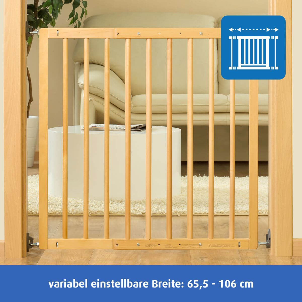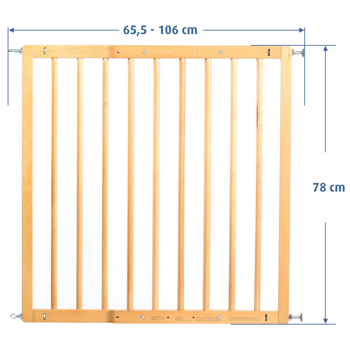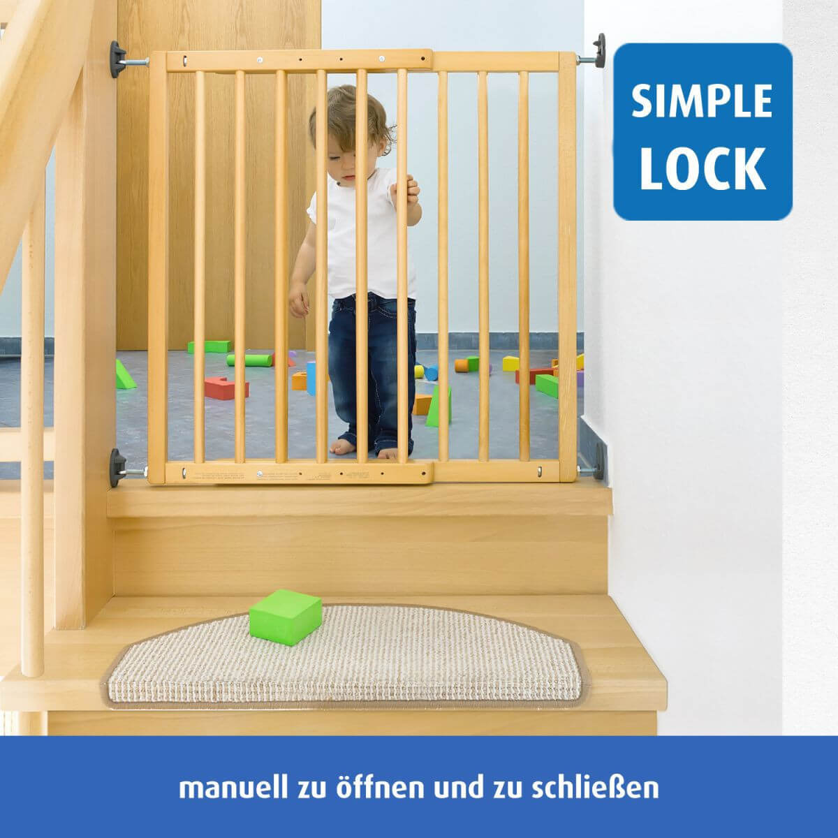 Променливото 4-точково закрепване позволява индивидуално регулиране на ширината на решетката до различни ширини в горната и долната област, например наклонени стени, ленти за килим. Възможност за избор на посока на отваряне Специалната структира не намалява пълната ширина на прохода В комплекта е включена тапа за ограничаване посоката на отваряне Simple-Lock: системата за двойно заключване обезопасява допълнително - натиснете надолу заключващата скоба, повдигнете решетката, за да я отворите; Безопасен за деца, но лесен за използване от възрастни с една ръка Височина: 78 см Само за домашна употреба на закрито!