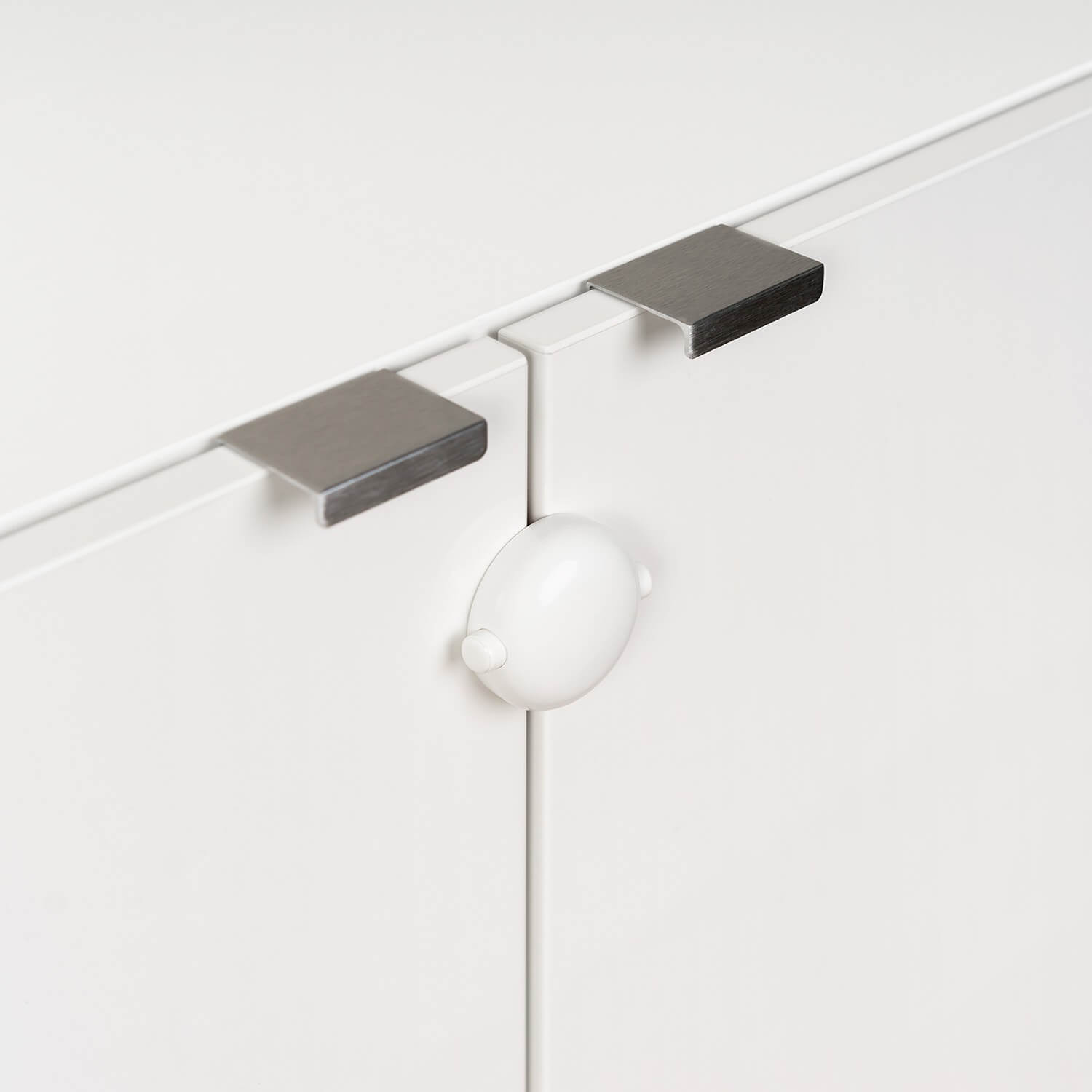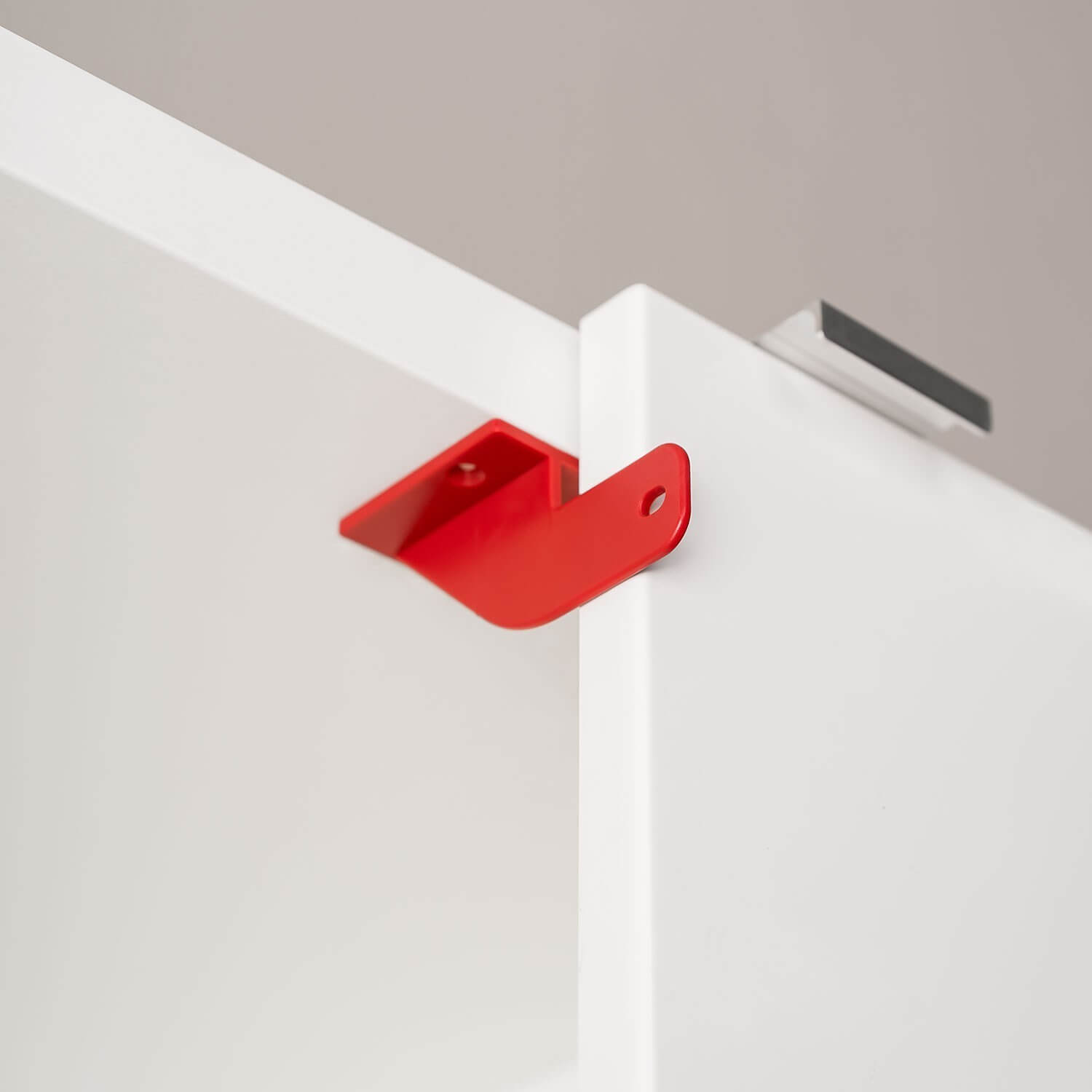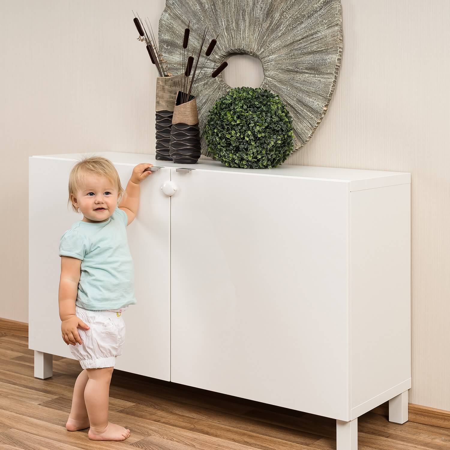 Заключване за двойни шкафове Reer 71020. Съдържанието на шкафовете е особено вълнуващо за най-малките. След като се научат да пълзят и да ходят, те лесно могат да достигнат до остри предмети или отровни почистващи препарати. За да предпазите малкото си дете от подобни опасности, особено важно е да заключите шкафовете с брава, защитена от деца. Заключването на шкафа се доставя с практичен помощник за сглобяване, което прави тромавите измервания и маркиране ненужни. Той позволява прецизно закрепване за още по-голяма сигурност. Просто изберете вида на закрепването, който съответства на вашата мебел, свържете ключалката към закрепващия компонент, поставете го върху шкафа, залепете или завийте - това е всичко. Сглобяването се извършва от вътрешната страна на шкафа, така че външните повърхности на вашите мебели да останат незасегнати. Шкафовете и съдържанието им са безопасно заключени далеч от малките деца. За възрастни обаче е лесно да отворят ключалката с една ръка. Включена е практична магнитна стойка за стена, за да може ключалката да се съхранява безопасно, когато шкафът е отворен и да може да се намери отново по всяко време. Червената маркировка ви напомня да активирате заключването отново, когато присъстват деца. Разгледайте още продукти от категорията "Бебешки аксесоари" ТУК!