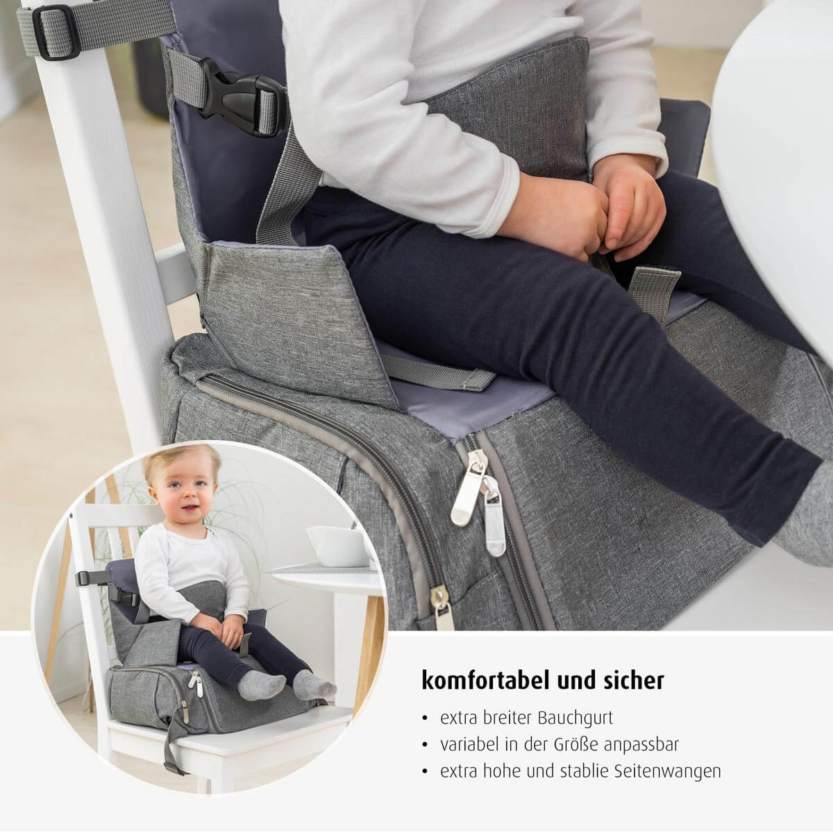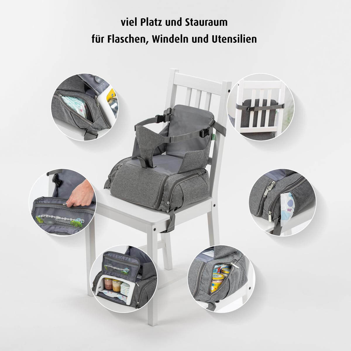 Безопаснo сгъваемо столче за хранене, подходящо за път Веднага след като децата могат да седят самостоятелно, те вече могат да се хранят заедно с другите членове на семейството на масата с подходящо столче за хранене и да участват заедно в семейни дейности. Със сгъваемото столче Growing можете лесно и безопасно да поддържате новата си рутина на хранене не само у дома, но и в движение, защото мобилната седалка предлага безопасно седене, независимо дали у дома, с приятели, в ресторант или на почивка. Универсална употреба Независимо къде се намирате, благодарение на гъвкавия дизайн, седалката ще е винаги на разположение. Единственото задълижтелно изискване към стола, върху който ще се поставя за най- стабилно закрепване и ненакланяща се стойка, са столът да има стабилна облегалка и седалка с размери най-малко 44 см х 35 см Сигурно задържане Дори и при варианта на мобилното столче за хранене, безопасността не трябва да е на заден план. Ето защо тази седалка е оборудвана и с основни предпазни колани, които предлагат на вашето дете необходимата безопасност в столчето за хра