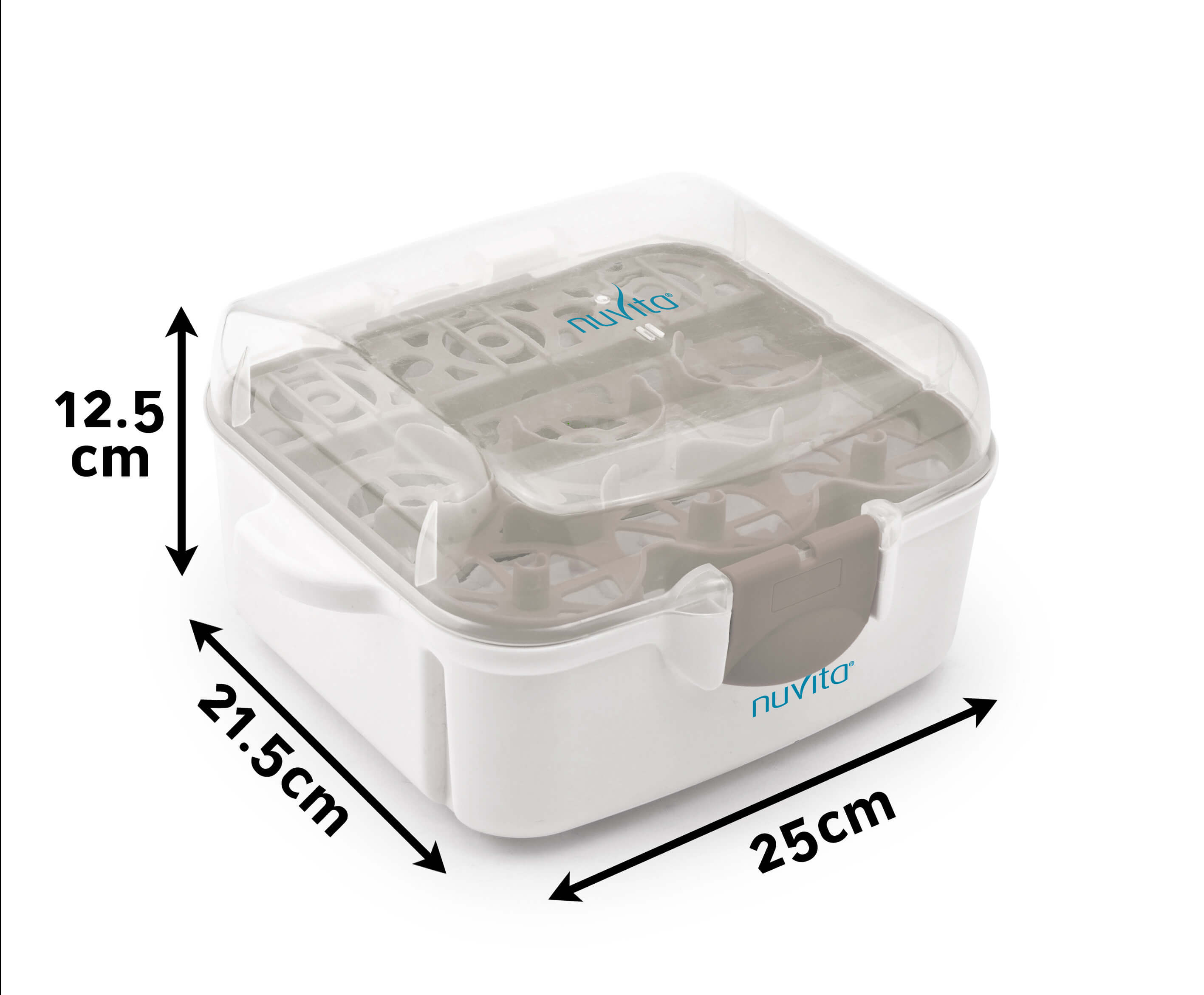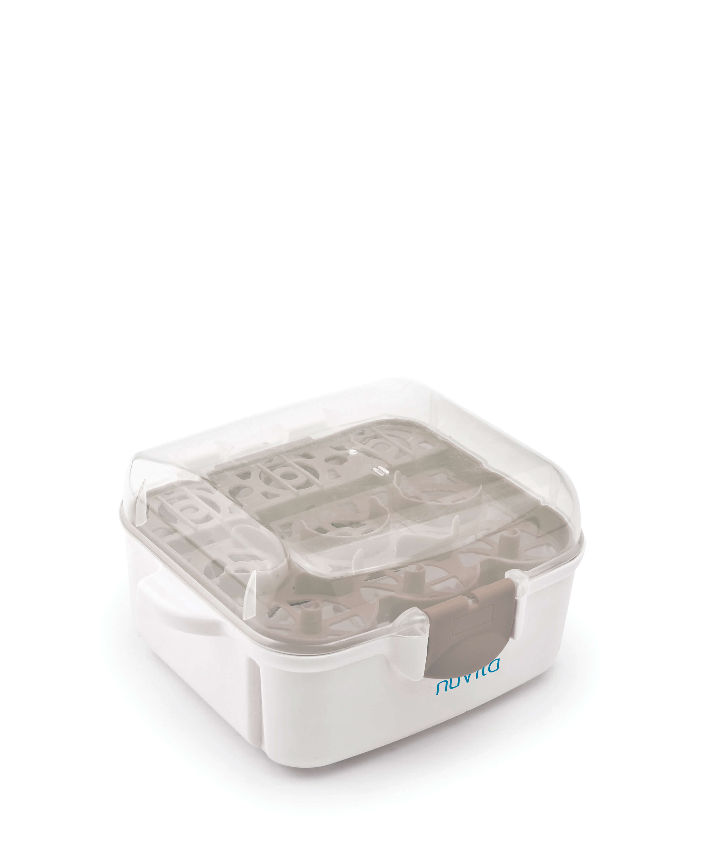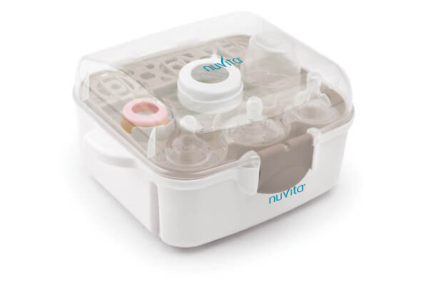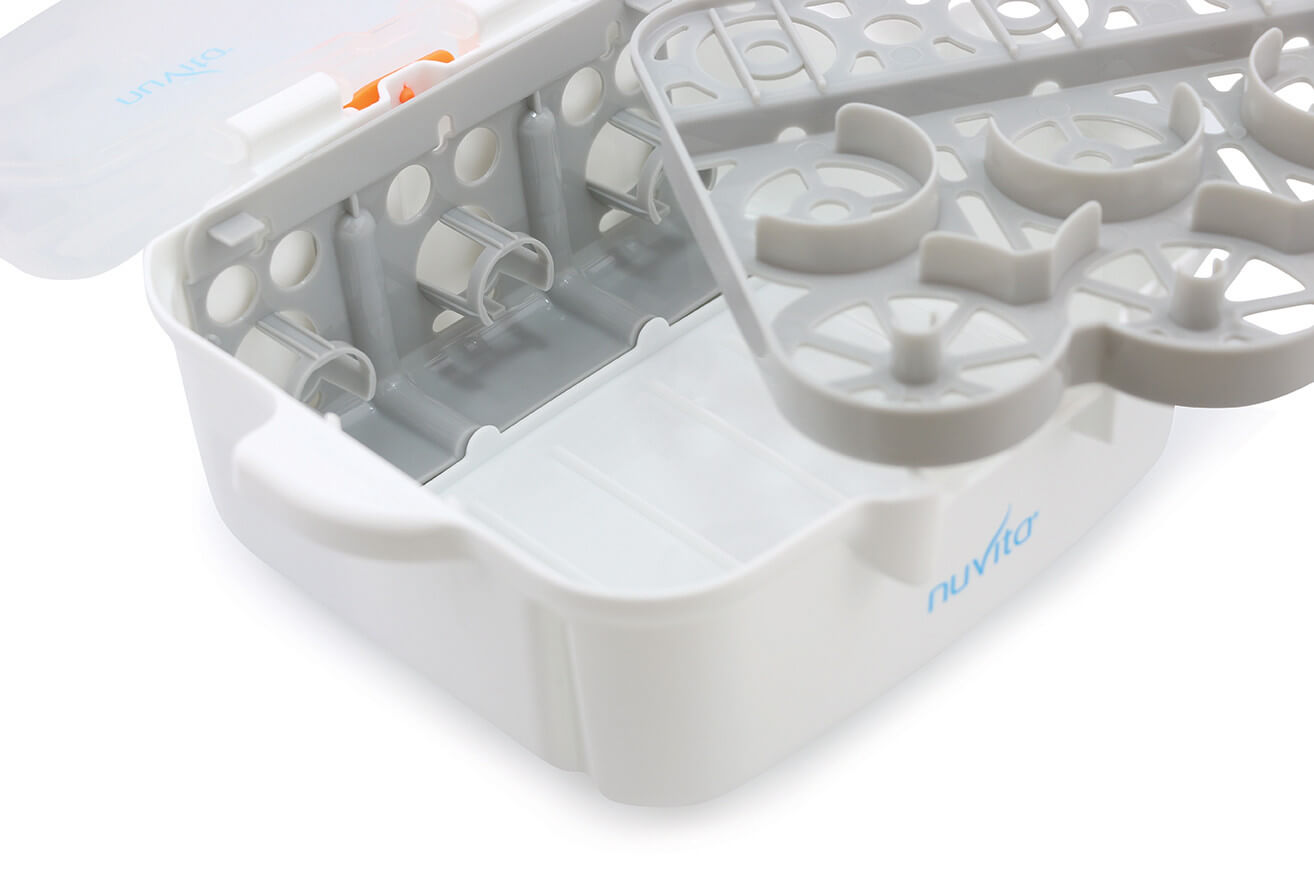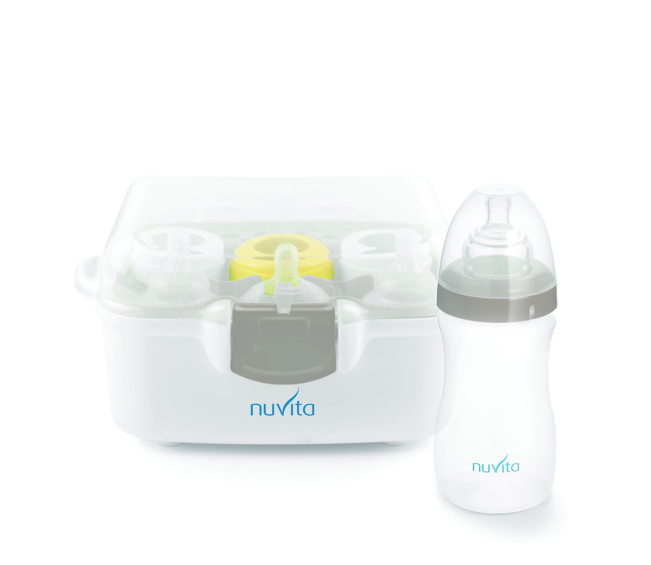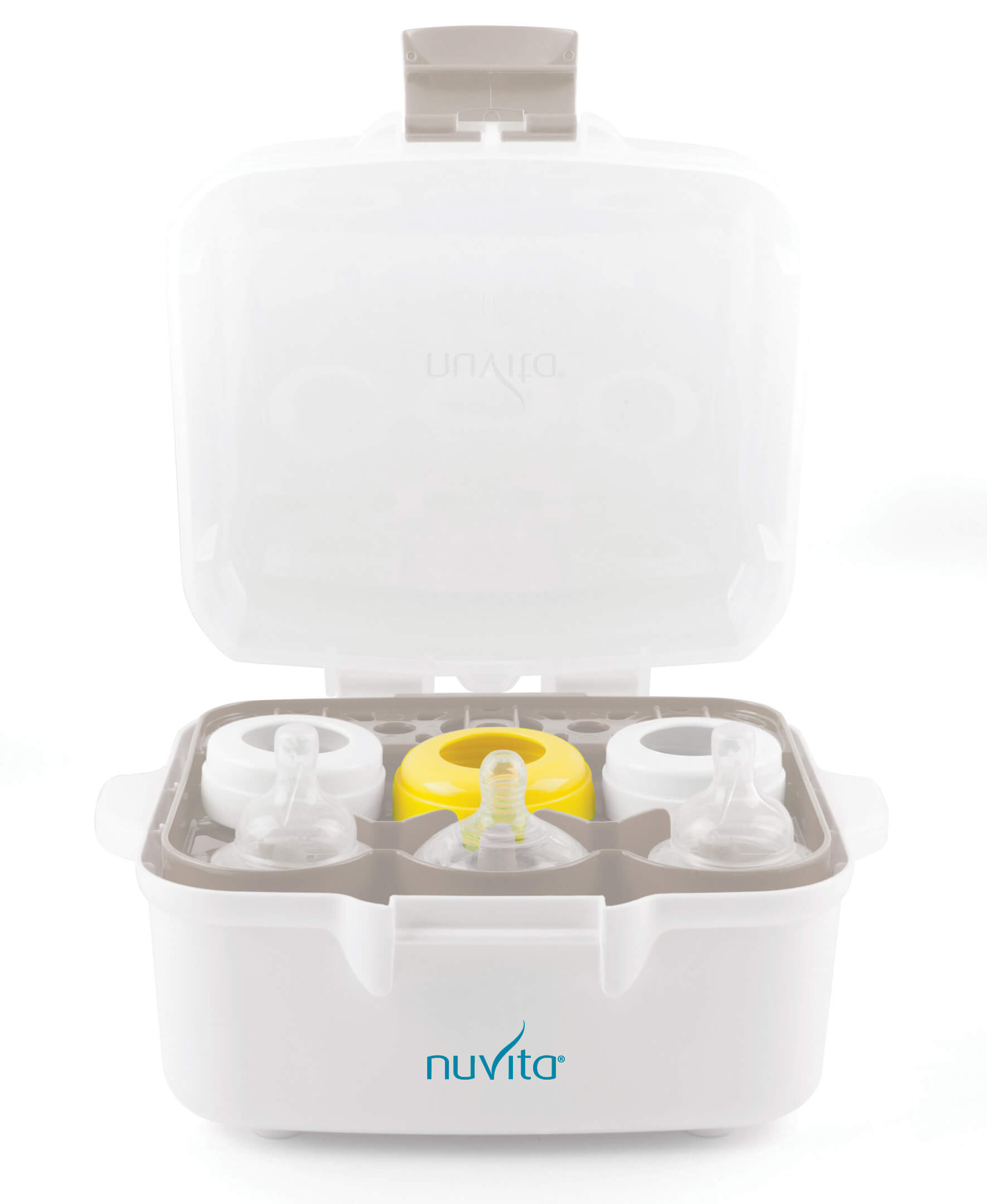 Стерилизатор за микровълнова фурна Nuvita 1085. Капакът на стерилизатора има странична закопчалка за по-голяма сигурност по време на работа. Малък отвор отзад помага за премахване на остатъчна вода в уреда. След като се извади от микровълновата, ако капакът остане затворен, съдържанието остава стерилно за 24 часа. Капацитет- 3 комплекта. Разгледайте още продукти от категорията "Бебешки аксесоари" ТУК!