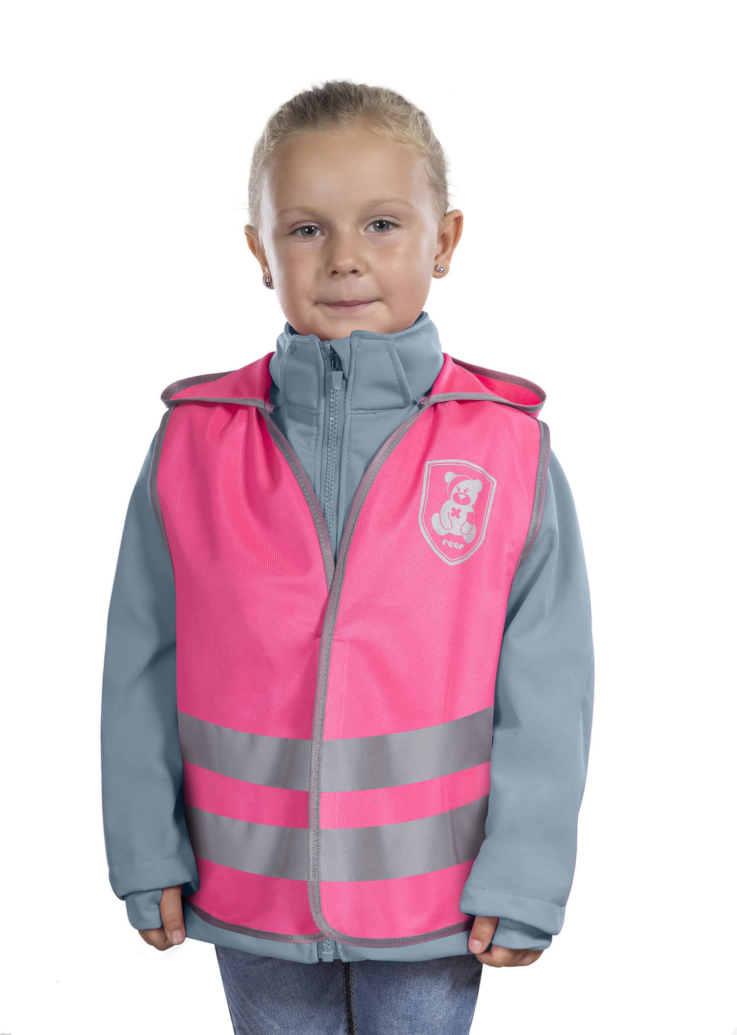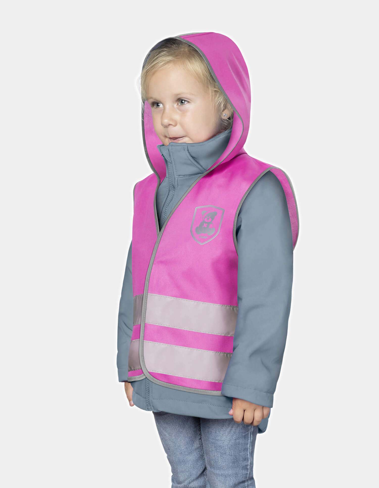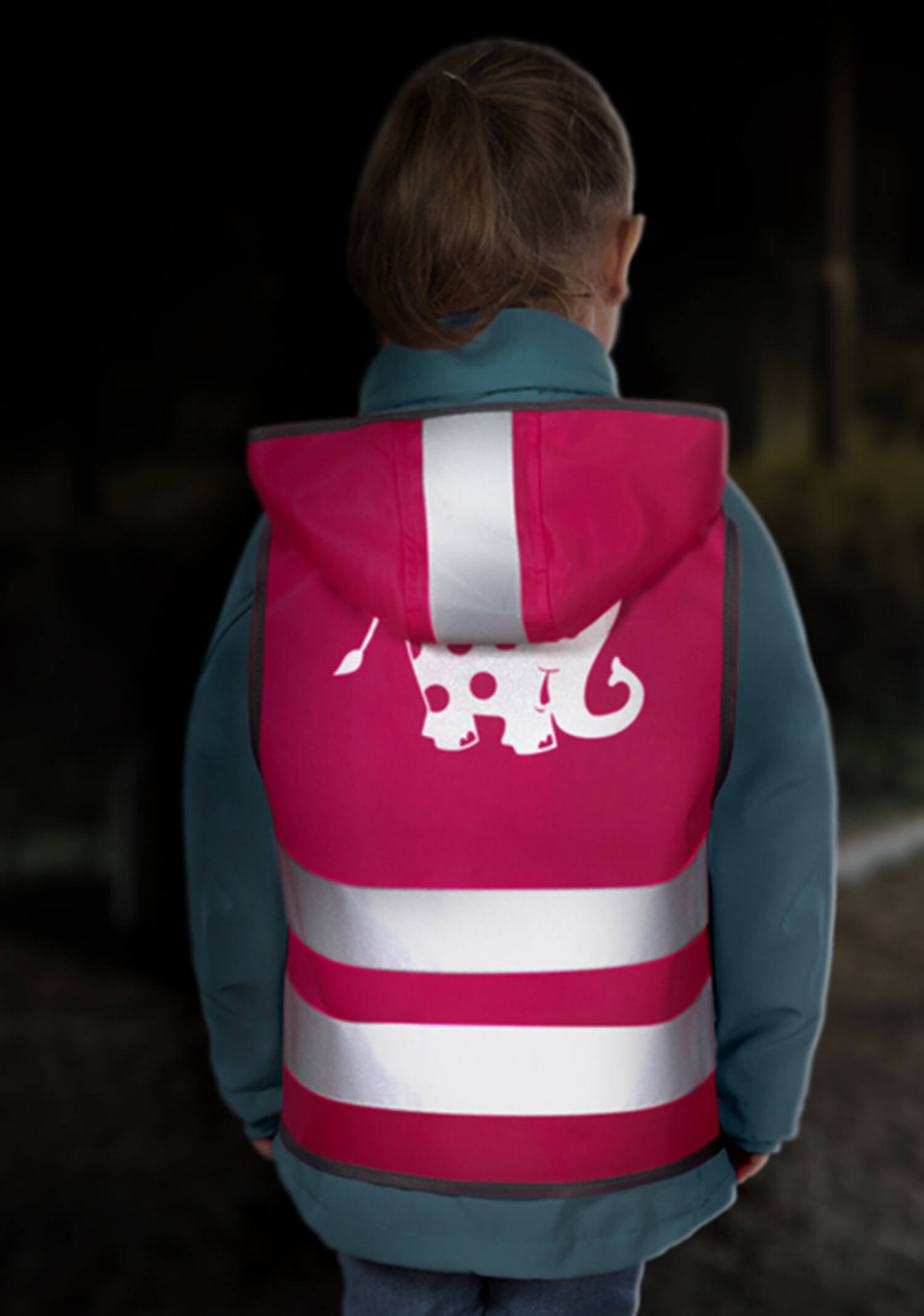 Увеличава видимостта в тъмното и при лошо време Ярките сигнални цветове и 2 широки отразителни ленти Практична качулка също с отразителна лента Детски светлоотразителни мотиви Велкро закопчалка за регулиране на размера Поле за надписване Широка кройка за удобно обличане върху нормалните дрехи Материал: полиестер, пере се