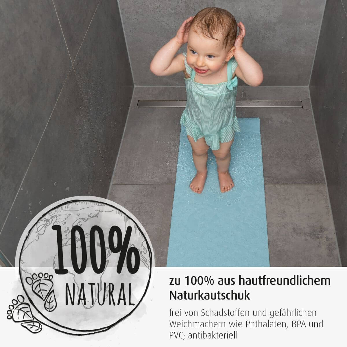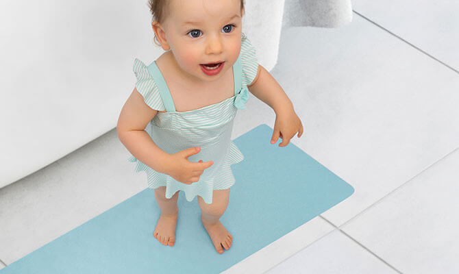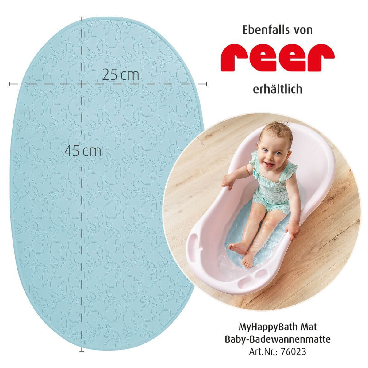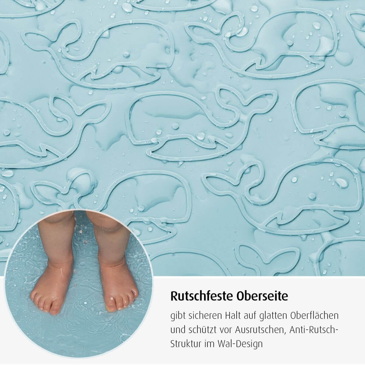 За нехлъзгащо се забавление при къпане Децата се чувстват комфортно във водата и се радват да играят. Въпреки това, водени от любопитство и желание за игра, те често са много непредпазливи. Не напълно развитото чувство за баланс на вашето малко съкровище може да доведе до неприятни ситуации. Подложката MyHappyBath е специално изработена за безопасно къпане , осигурява на детето необходимата опора и предотвратява подхлъзване във ваната. Идеална за къпане на бебета Правоъгълната форма се вписва идеално във всички класически бани. С размери 97 см х 36 см, прави не само използването във ваната удобно и безопасно, а цялата баня. Прецизно прилягащата форма осигурява опора без образуване на гънки - за удобно сядане на най-малките. Защита против хлъзгане Подложката е изработена от естествен каучук. Благодарение на естествените неплъзгащи се свойства на материала, подложката за баня осигурява на бебето сигурна защита срещу подхлъзване по гладките повърхности в банята. Горната страна е в сладък дизайн на кит, който също има противхлъзгащ ефект - за още по-надеждно задържане при игри по вре