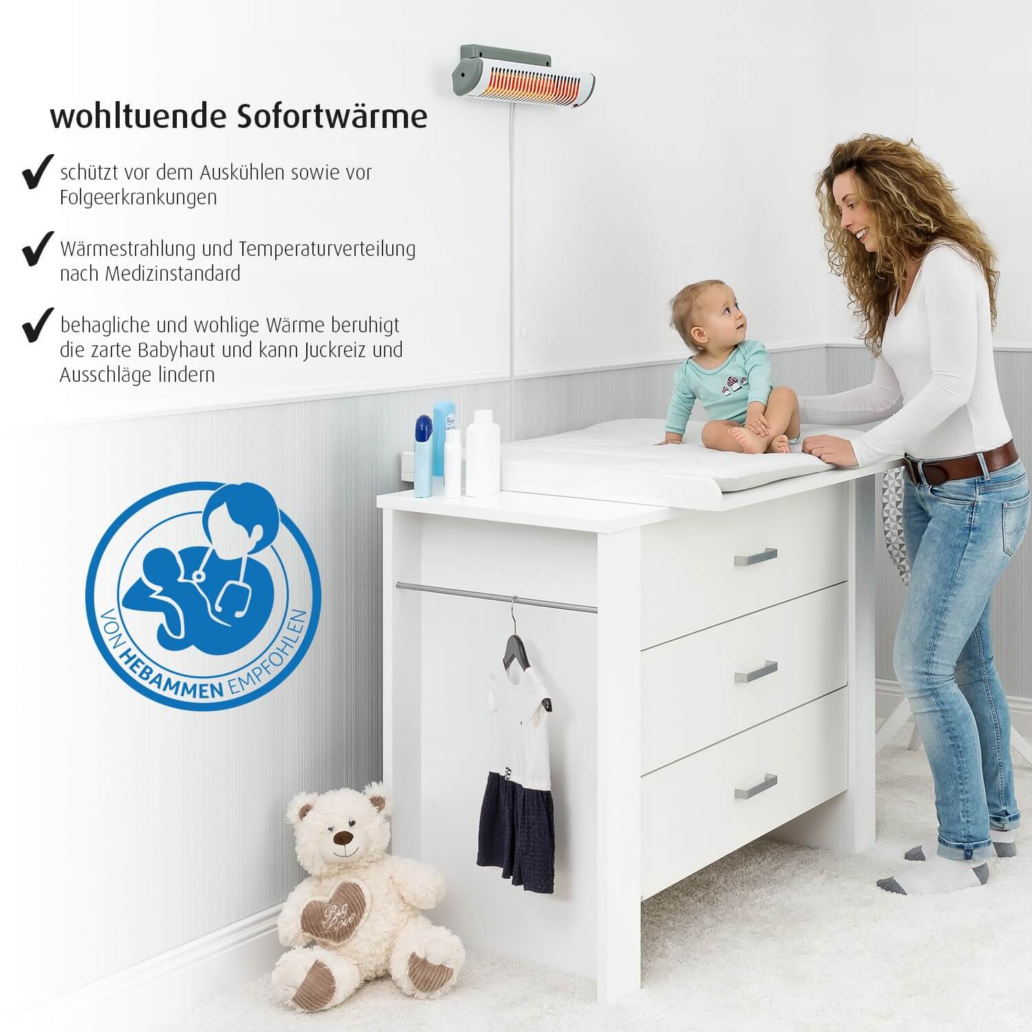 Перфектна защита срещу настинки За бебетата топлинната регулация през кожата все още не е напълно развита. Следователно те не са в състояние да настроят собствената си телесна температура на падащи температури и бързо са изложени на хипотермия веднага след къпане или по време на смяна на пелената. Ето защо е особено важно да се поддържа телесната температура на бебето. Нагревателят за повивалник EasyHeat осигурява на вашето бебе незабавна топлина. Поддържа постоянна комфортна температура и компенсира температурните разлики. Това предотвратява вторични заболявания, като настинки, и гарантира на вашето бебе много приятни моменти. Приятна топлина точно където е нужна EasyHeat излъчва топлина равномерно към повивалника и по този начин осигурява разпределение на температурата в съответствие с медицинските стандарти. Благодарение на енергоефективните 500W, мощността на устройството е идеално съобразена с нуждите на вашето бебе. В допълнение, накланящият елемент, който може лесно да се регулира до 50 °, гарантира, че можете да насочите топлинното излъчване точно до желаното място....
