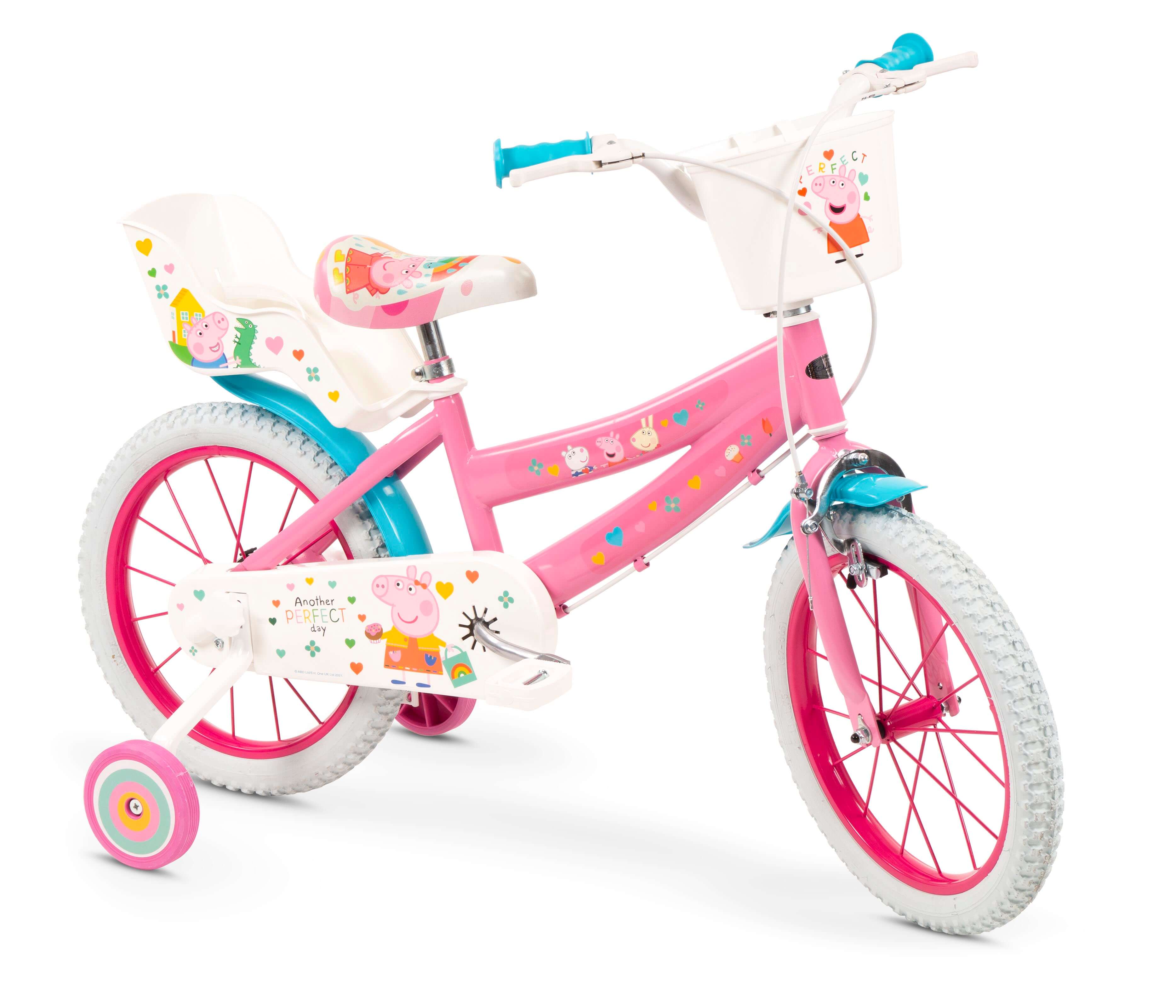 Истински привличащ вниманието велосипед!- 16 инчови колела - Спирачка на джанта отпред, барабанна спирачка отзад - Подвижни помощни колела - Кош за багаж С този велосипед в цветен дизайн на Peppa Pig, младите състезатели са на първите си обиколки по особено шик и безопасен начин. Благодарение на подвижните помощни колела и регулируемата по височина седалка и кормило, велосипеда расте с размерите и уменията на ездача. Спирачката на джантата отпред и барабанната спирачка отзад, с удобни за децата дръжки на кормилото, гарантират безопасно ускорение. Над веригата е монтиран предпазител, който предпазва от наранявания. По време на обиколки в лошо време калниците предпазват от дъжд и кал. И тъй като е важно да има къде да возите любимите предмети, отпред на кормилото има кош за най-важните неща. Така че нищо не стои на пътя на разходките с първия собствен велосипед. Подробности:- Стоманена рамка със стикер в Peppa Pig дизайн - Спирачка за джанта отпред, барабанна спирачка отзад, с удобна за деца дръжка на спирачката - Стикер за предните и задните помощни колела - Гуми с дебел профил н