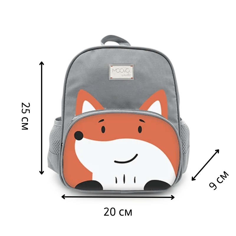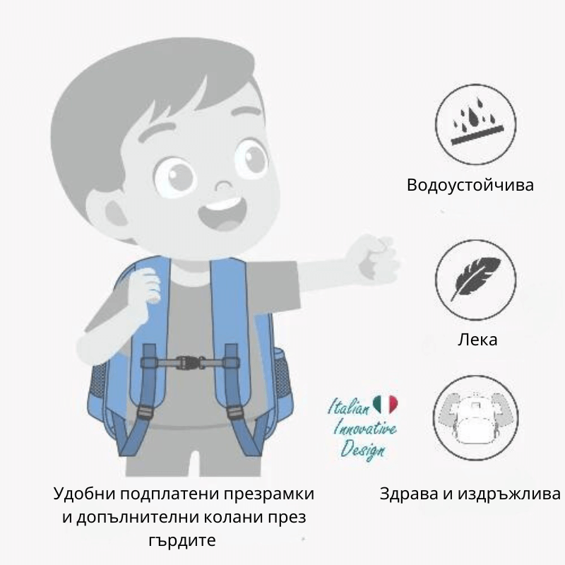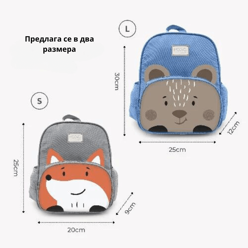 Идеална за ясла, детска градина или еднодневна екскурзия. Изработена от здрав и водоустойчив материал, но в същото време супер лека и удобна за носене от малки деца.Раницата има основно отделение с широк отвор с цип, малък преден джоб с цип два странични мрежести джоба.Подплатените презрамки и регулируем колан за гърдите осигуряват комфорт при носене.Вграден текстилен етикет за контакти/персонализиране. Раницата се предлага в 2 варианта: Размер S: 25x20x9 см Размер L: 30x25x12 см И 8 симпатични цветови комбинации с лика на любими животинки: Малката е подходяща деца на възраст между 1 и 3 години.Голямата е подходяща за деца на възраст 3-6 години.