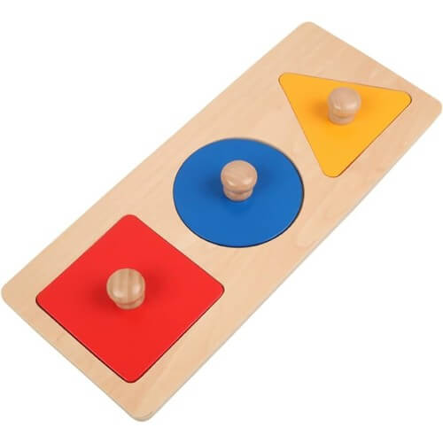 Играта се състои от правоъгълна дървена основа и три фигури с различна геометрична форма и цвят. Всяка една от фигурите има дръжчица, от горната страна, където, с помощтта на която деца в най-ранна възраст, могат лесно и удобно да я хващат и задържат. На всеки елемент съответства дупка, изрязана в основата, където те да се поставят. Целта на играта е детето да постави всички елементи на съответстващите им места.Играта развива фината моторика на ръцете и пръстите на детето, а също така търпението, вниманието и концентрацията му.Размери: 22х9х3см, Тегло: 200гр.Заниманията с тази игра са подходящи за деца над 12 месеца.В сайта ни ще намерите богат избор от Монтесори материали и играчки.А в блога ни ще откриете полезна информация за метода Монтесори.Smart Baby предлага детски книжки, мебели, козметика, играчки и Монтесори материали.