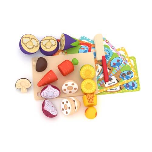 Дървените зеленчуци за рязане са изработени от висококачествен дървен материал. Комплектът съдържа:- царевица, патладжан, морков, картоф, лук и гъбка;- дървено ножче за рязане;- дъска за рязане.Всеки един от зеленчуците е съставен от две, три или четири части, които се съединяват с велкро по средата. Целта на играта е децата да поставят един по един дървените зеленчуци на дъската за рязане и да ги разрежат с дървеното ножче.Играта с дървените зеленчуци развива моториката на ръцете, координацията на движенията очи-ръце и пространствената ориентация.Размери на кутията: 25х19х6см.Тегло: 500гр.Играта е подходяща за деца над 3 години.