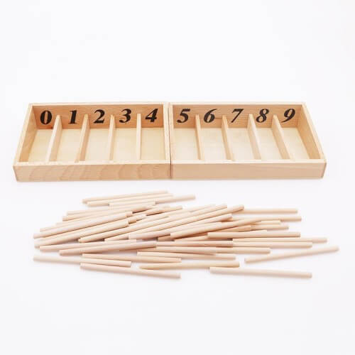 Материал на Монтесори, който е изработен от дърво. Състои се от 2 еднакви дървени кутии без капаци, всяка от които е разделена с прегради на пет отделения. На горната част на всяко отделение са написани цифрите от 0 до 9. В комплекта се съдържат и 45 дървени пръчици, които трябва да се поставят в различните отделения на кутията. Целта на заниманията с този Монтесори материал е децата да се запознаят с количественото измерение на всяко цифра, а именно - колко отделни единици се съдържат в нея. Показва се цифрата 0 и се обяснява нейната стойност и значение. Показва се и естествената последователност на цифрите.Размери на кутията: 32,5х24,5х12 см, тегло: 1 кг.Подходящо за деца над 3,5 години. Препоръчително е преди заниманията с Кутия с вретена на Монтесори, детето да се запознае с Числовите летви и Комплект дървени плочки с числа.Семейството на Smart Baby предлага на своите клиенти разнообразие от качествени Монтесори материали и играчки.