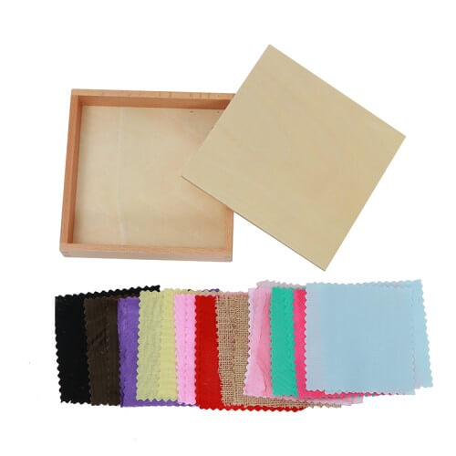 Дървена кутия, съдържаща 12 двойки парчета от различни платове.Заниманията с този Монтесори материал имат за цел да запознаят детето с различните текстури. В комплекта има по 2 парчета от един плат, като детето трябва да открие двойките. Някои от материите са с близки цветове за да се стимулира детето да разчита на ръцете си за да разбере разликата. С тези занимания се развиват сензорните възприятия на детето.Размери на платчетата: 11х11смРазмери на кутията: 17х17см.Подходящо за деца над 2 години.Повече за Мария Монтесори може да прочетет тук.При нас, Smart Baby може да откриете богат избор от Монтесори материали и играчки.