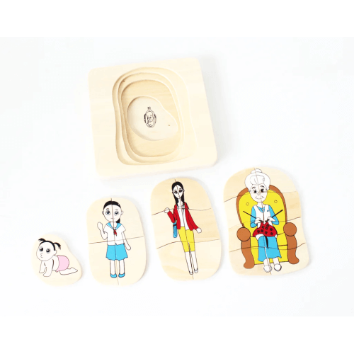 Дървен пъзел с различните етапи от живота на жената.От бебе до баба - интересните стадии от живота на човек са представени в този пъзел. На всеки елемент е изобразена картина от развитието на жена. Забавен начин детето да се запознае с кръговрата на живота. Това е Монтесори материал, с който детето ще развие своята финна моторика, координацията око - ръка и търпение.Размери на основата: 18х18 см.Подходящо за деца над 3 години.Информация за други полезни и занимателни Монтесори материали и играчки може да прочетете тук.