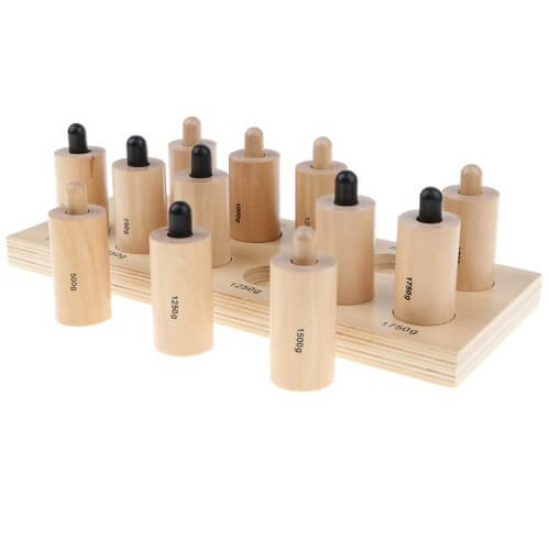 Материал на Монтесори, който е изработен от дърво. Продуктът се състои от 12 дървени цилиндърчета и дървена основа, в която те се поставят. Всеки цилиндър има малка дръжчица в горната част, която при натиск оказва съпротивление. Цилиндрите се делят на две групи – с бяла и с черна дръжка. При натиск тези дръжчици оказват различно съпротивление от 500 до 1750 грама. Цилиндрите в двете групи са еквивалентни, тоест съпротивлението на всеки един цилиндър с черна дръжка отговаря на същата стойност на цилиндър с бяла дръжка.При работа с тези цилиндри децата осъзнават, че въпреки еднаквата форма на предметите, те трябва да приложат различна сила, за да натиснат дръжчицата. Освен това заниманията с този продукт развиват моториката на ръцете и пръстите.Размер: 30х10х10см, тегло: 750гр.Заниманията с този продукт са подходящи за деца над 3 години.Повече за Мария Монтесори може да прочетет тук.При нас, Smart Baby може да откриете богат избор от Монтесори материали и играчки.